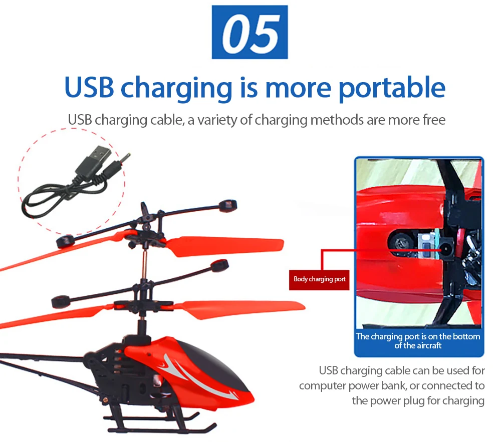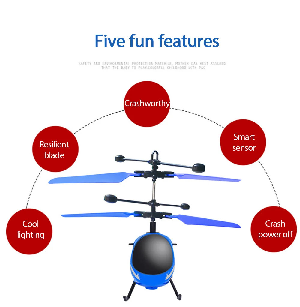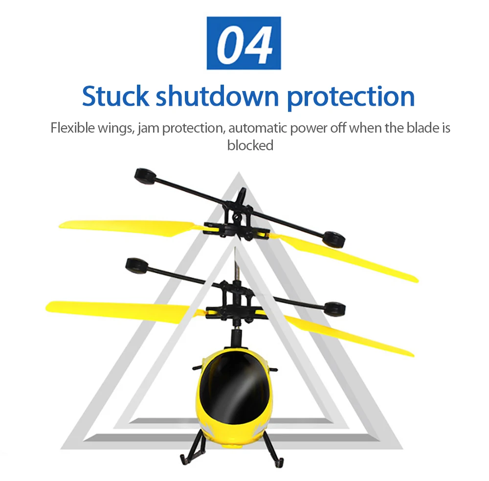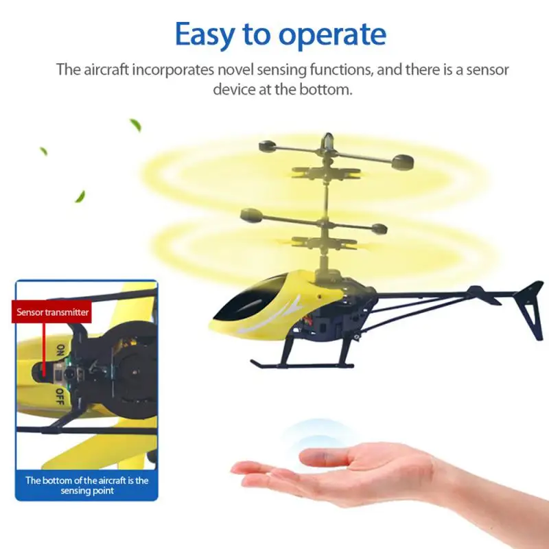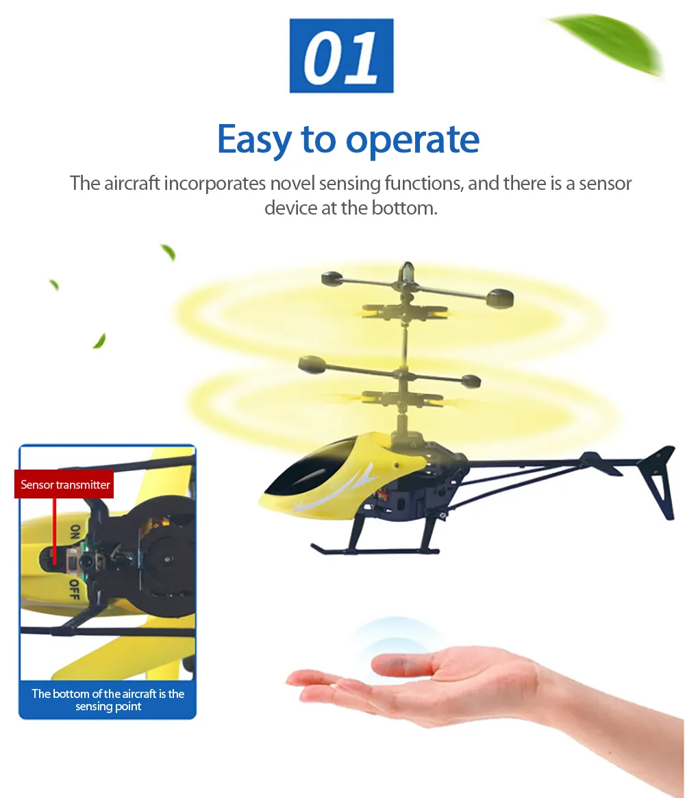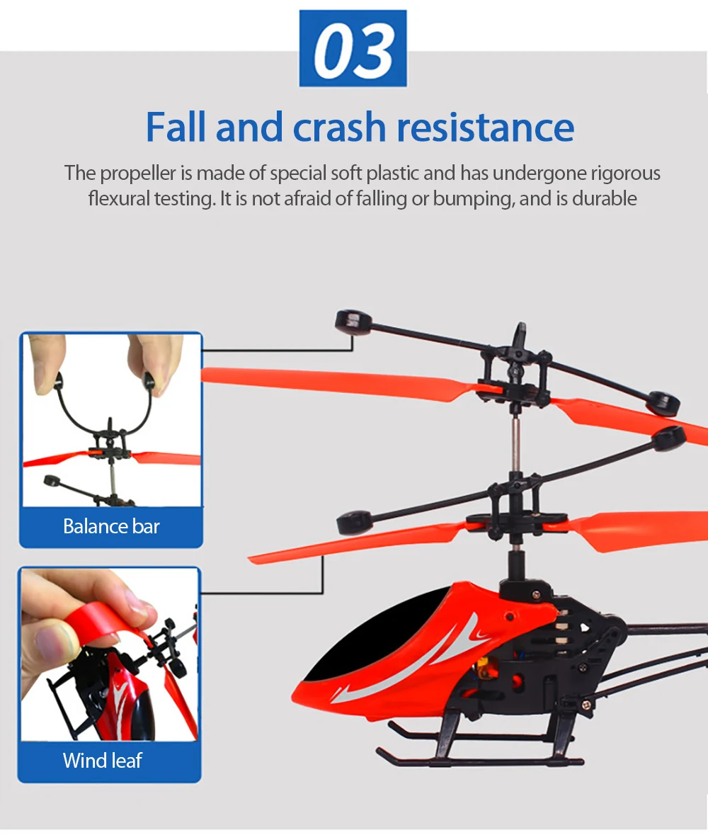 Full of Fun: The remote control induction helicopter is user-friendly, featuring anti-collision and anti-fall properties, making it highly playable. It operates with hand induction; when the helicopter descends, placing your hands below it causes it to rise again. Additionally, the remote can be used for turning it on/off and controlling acceleration.