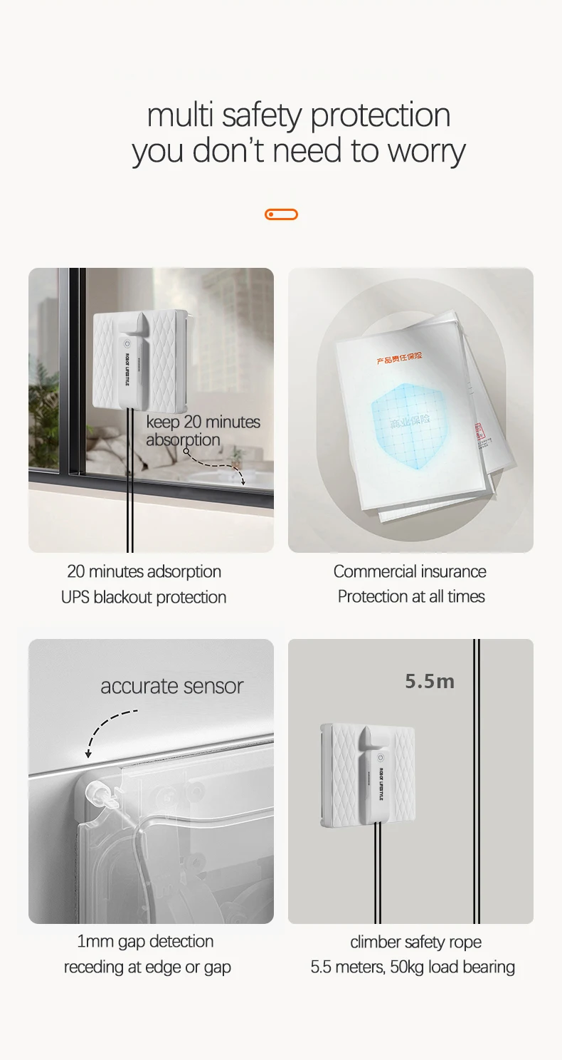 - Advanced Safety Features: Equipped with anti-fall technology, the cleaner ensures a safe operation every time, automatically detecting edges to prevent accidents.