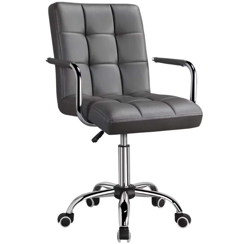 This swivel office chair is upholstered in soft faux leather, providing comfortable seating for extended periods. It features a heavy-duty design with an industrial-strength base composed of five conjoined steel bars. These bars curve gently, distributing the seating force to protect your floor and enhance the chair’s durability. Attached to the base are five noise-canceling casters crafted from high-quality materials, enabling a smooth 360-degree swivel for effortless movement between tasks. The chair’s versatile design allows it to be transformed into a bar stool style by simply omitting the armrests during assembly. Additionally, its water-resistant nature makes maintenance easy; a mild cleanser and a damp cloth are all that’s needed to keep it looking fresh and clean.