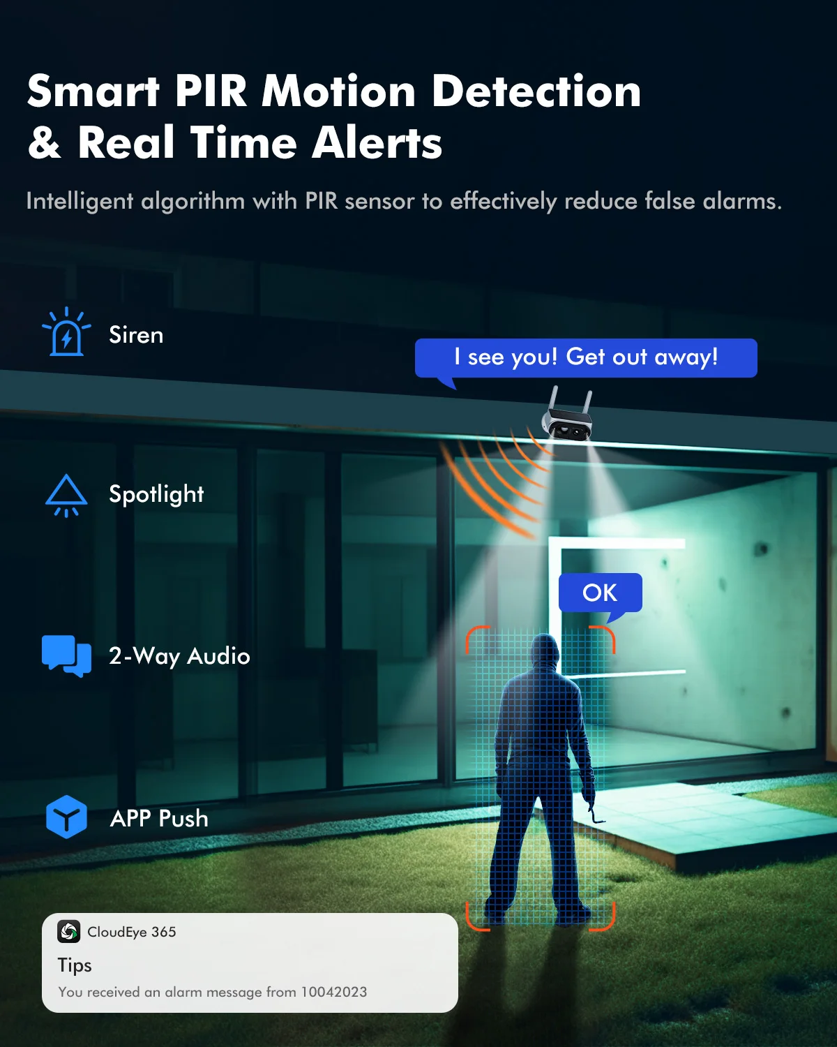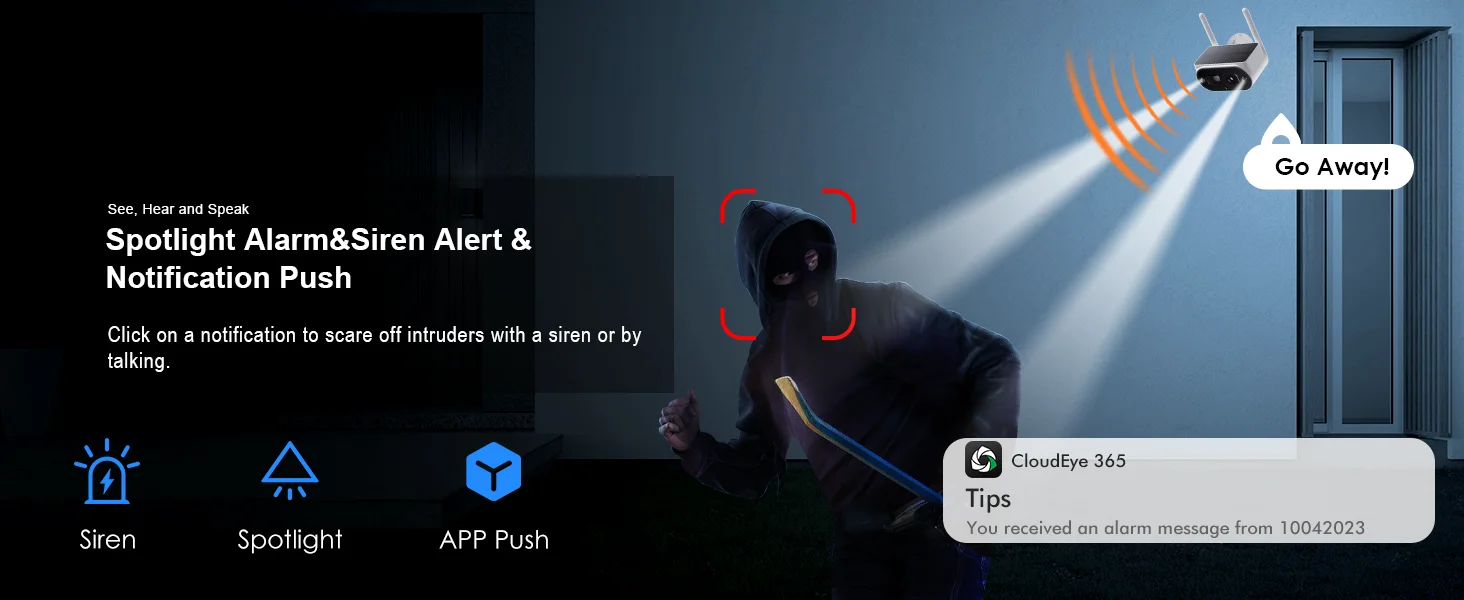 Our security cameras are equipped with advanced PIR sensors that effectively filter out false alarms triggered by mosquitoes, insects, and fallen leaves. When suspicious activity is detected, both the base station and camera issue alerts, while your phone receives notifications. You can respond to these alerts by activating a siren or roar to scare off intruders.