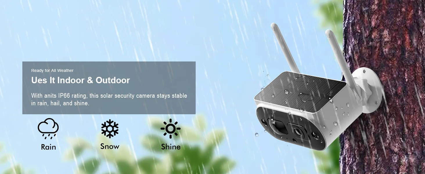 With its IP66 rating, this solar security camera remains stable in various weather conditions including rain, hail, and sunshine.