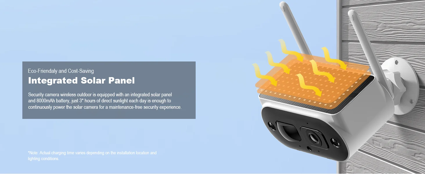 This solar-powered security camera comes with an integrated solar panel and a built-in high-capacity battery. It operates independently without any external power sources, allowing for flexible placement. This not only promotes environmental friendliness but also decreases the need for frequent disassembly to charge.