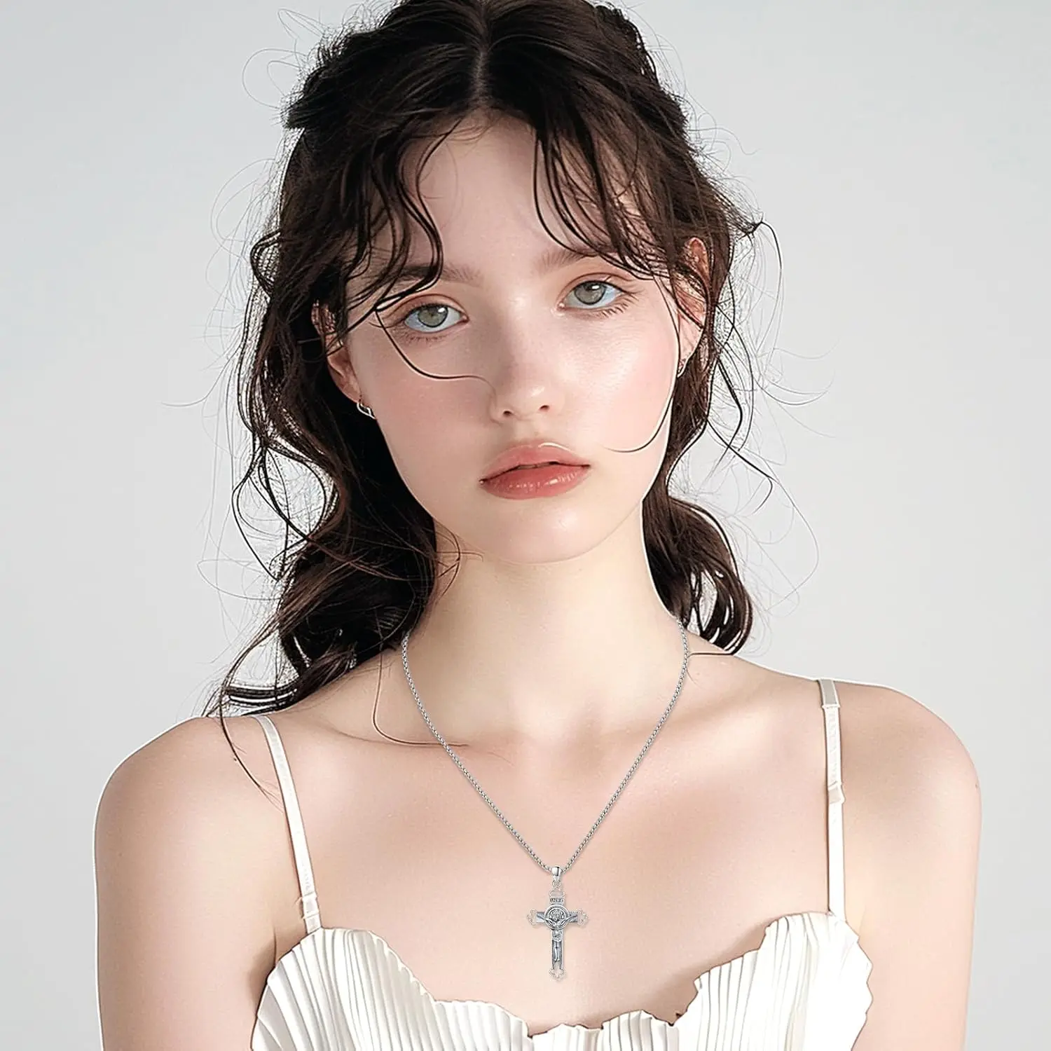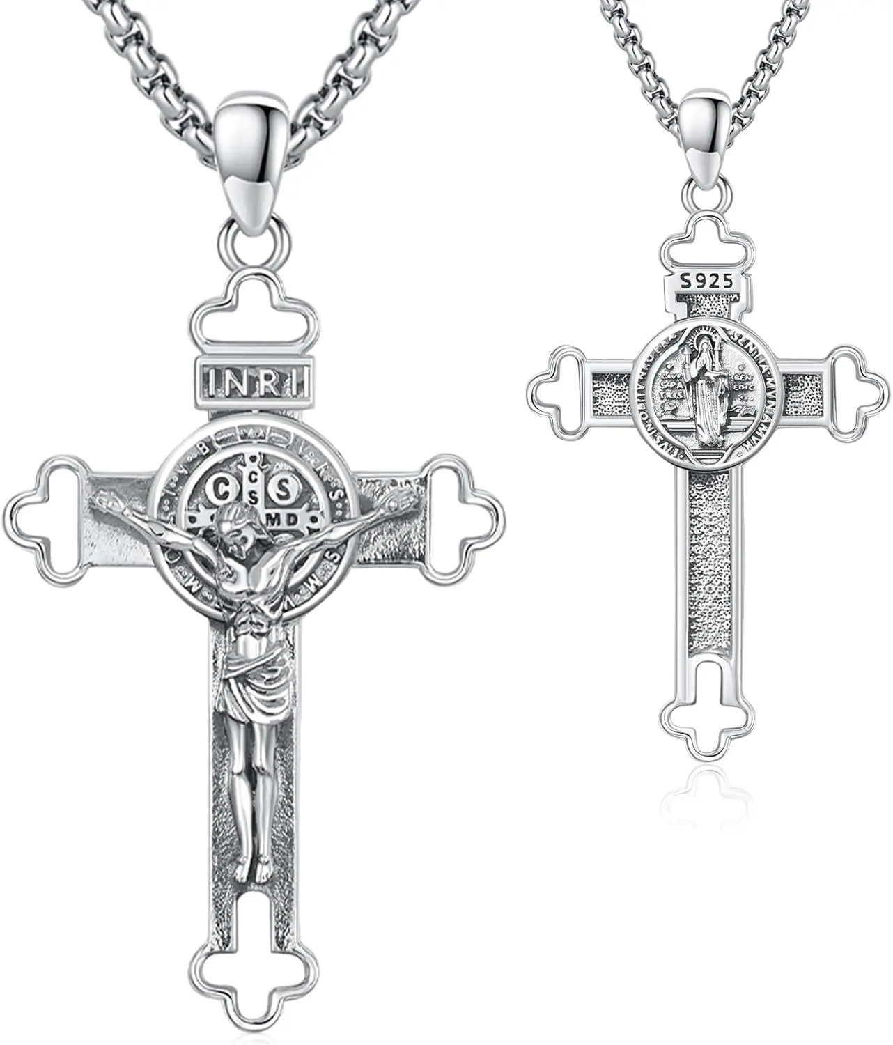 - Design: Traditional crucifix with the image of Jesus and an embedded Saint Benedict medal engraved “V R S N S M V – S M Q L I V Bâ€, a symbol of spiritual protection.