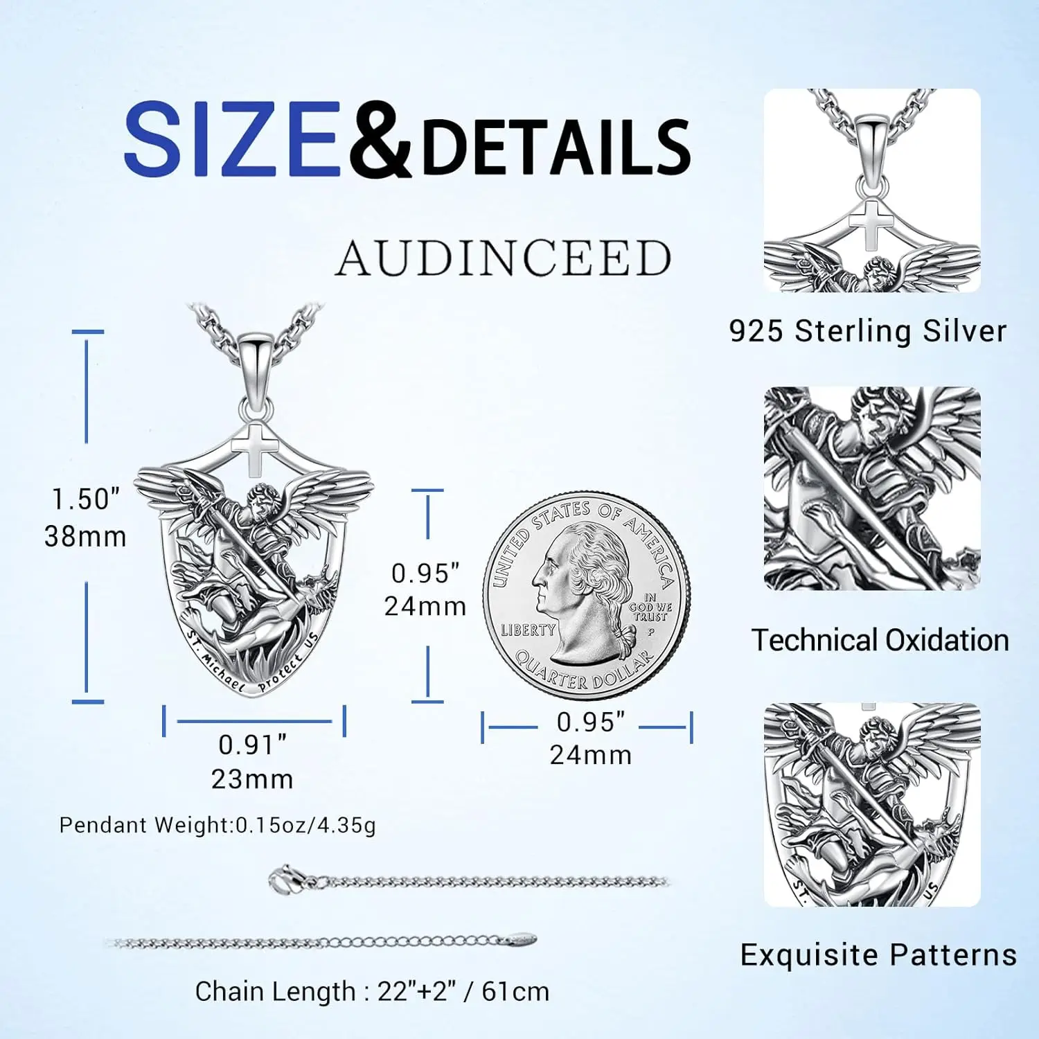 Gift Ready: Includes 1 gift box, 1 sterling silver Saint Michael pendant, 1 stainless steel chain, and 1 silver polishing cloth.