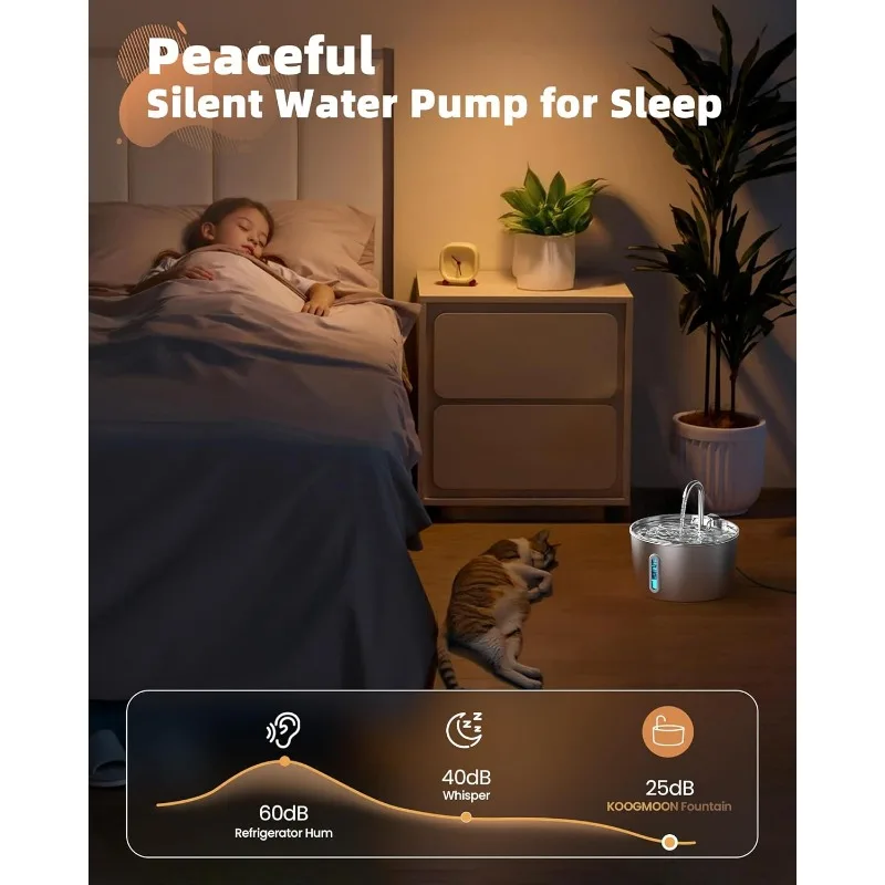 • Ultra-Quiet 5V Pump: Operating at less than 25 decibels, the ultra-quiet pump won’t disturb your or your pet’s sleep or daily life. The 5V low voltage design is safe and eliminates the risk of electric shock for both pets and humans.