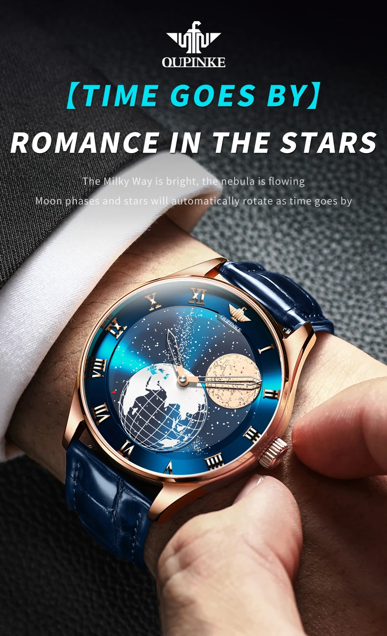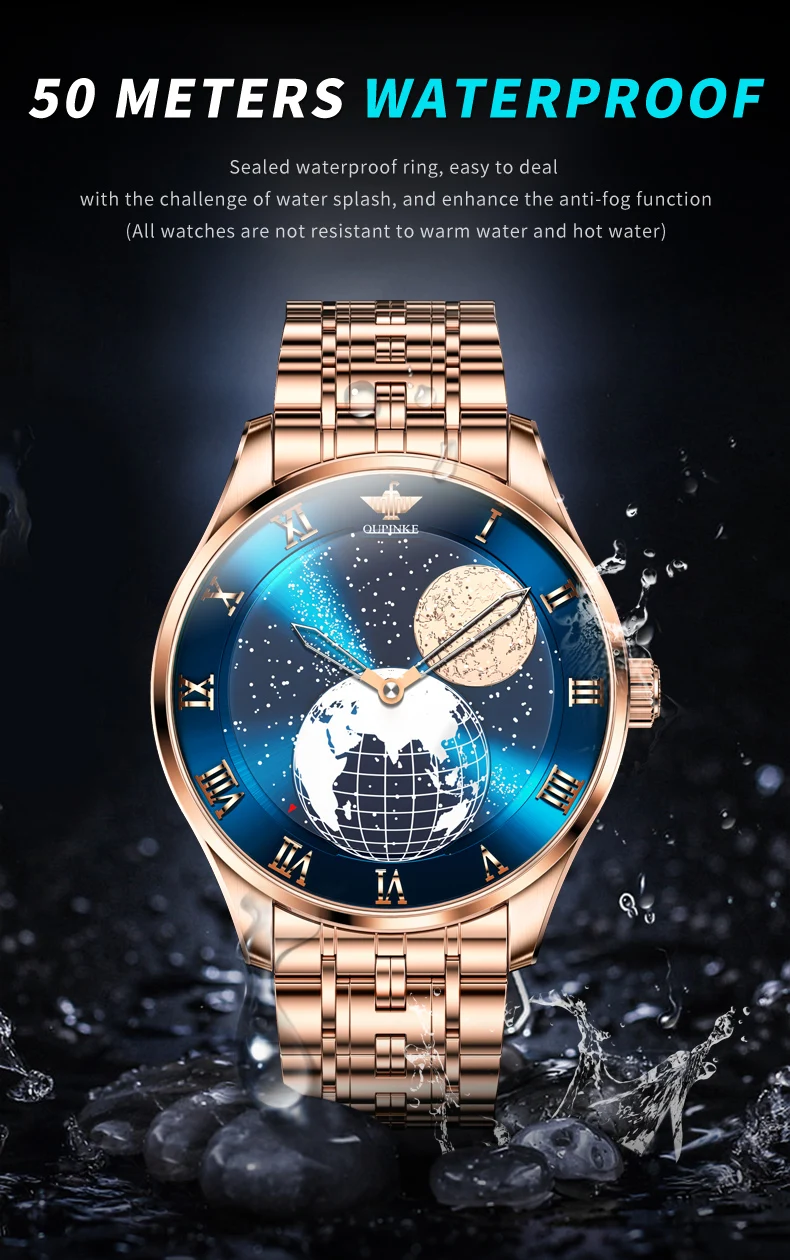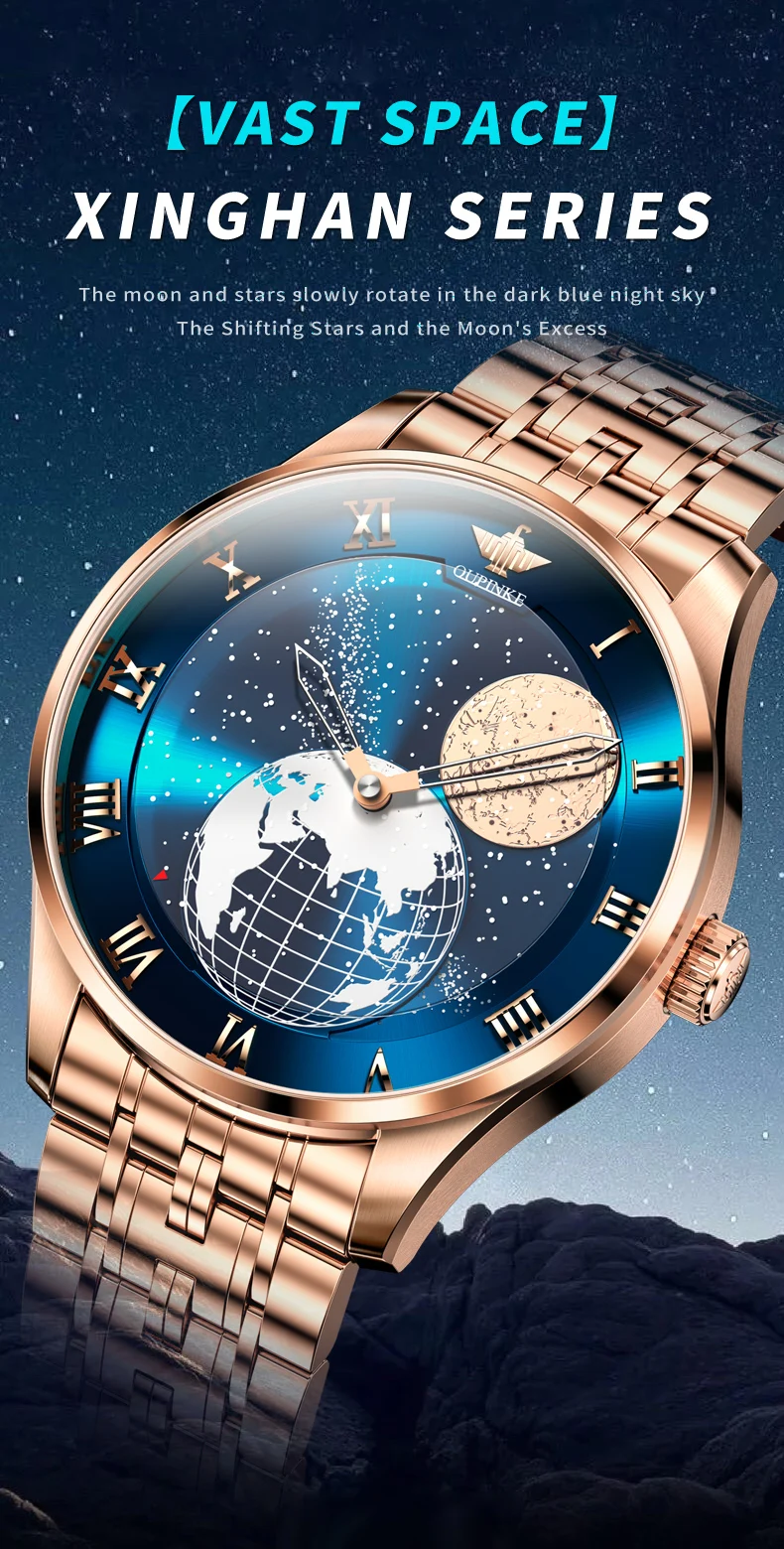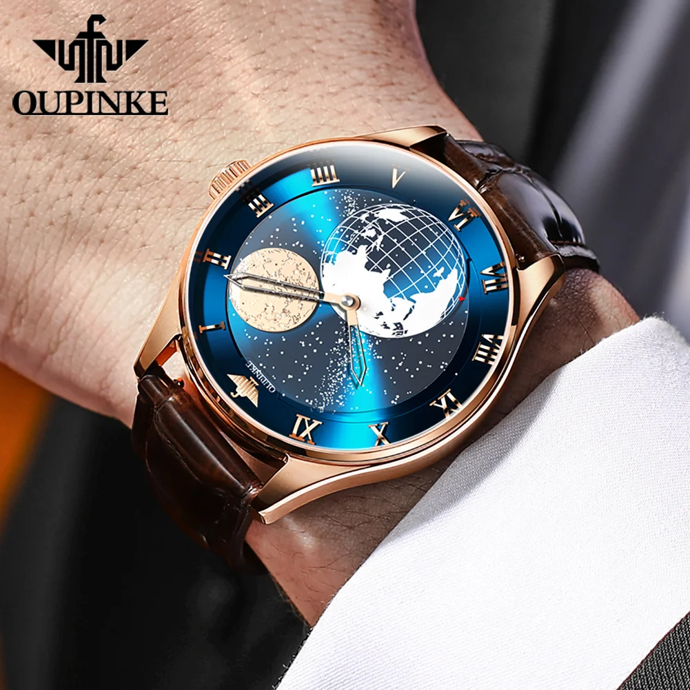 Discover the epitome of elegance and precision with the OUPINKE Automatic Mechanical Men’s Watch, a masterpiece that seamlessly blends innovative design with timeless luxury. This exquisite timepiece features a captivating 3D Earth starry sky rotating dial, offering a unique glimpse into the cosmos from your wrist. Powered by a sophisticated Japanese movement, this watch ensures impeccable timekeeping and durability.