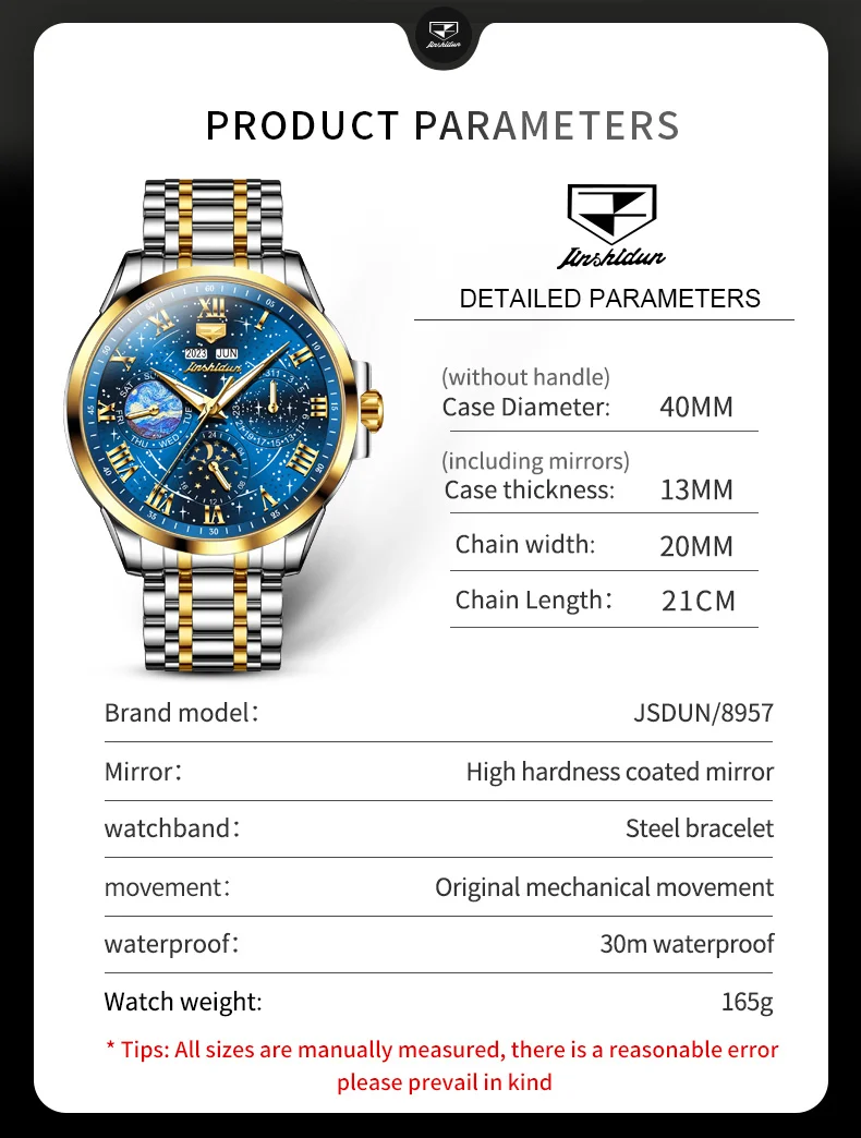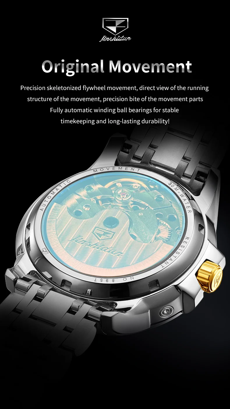 The JADUN watch is powered by an automatic movement, ensuring accurate timekeeping without the need for batteries. It is also water-resistant, allowing you to wear it with confidence in various settings, whether you’re attending a formal event or engaging in everyday activities. The luminous hands and markers provide visibility in low light conditions, ensuring you can always tell the time at a glance.