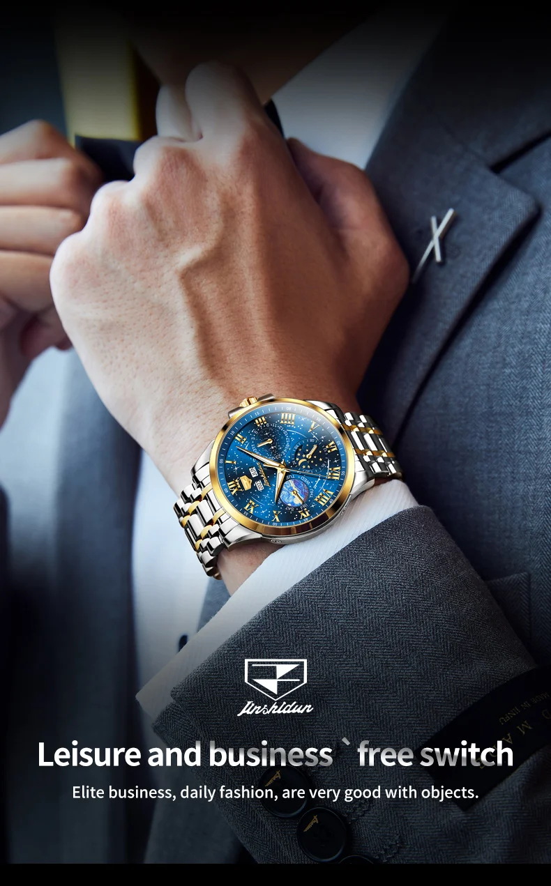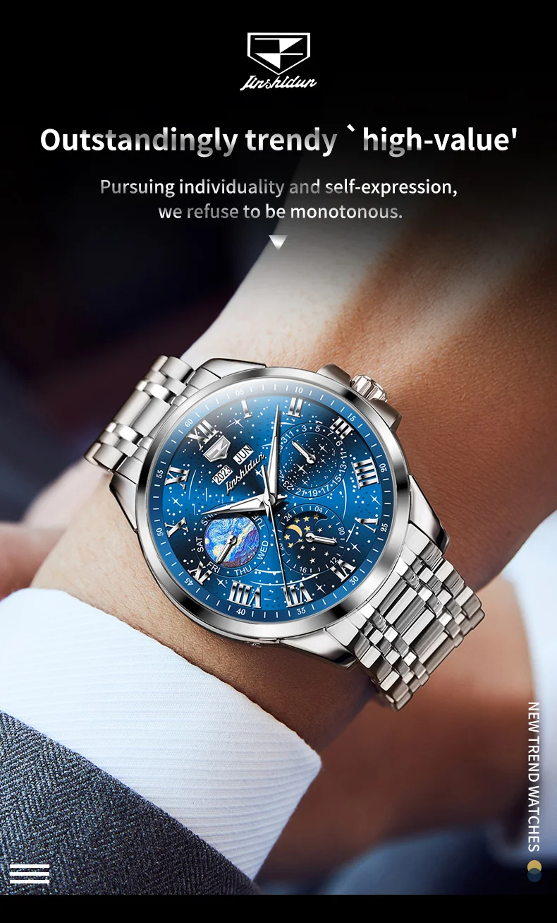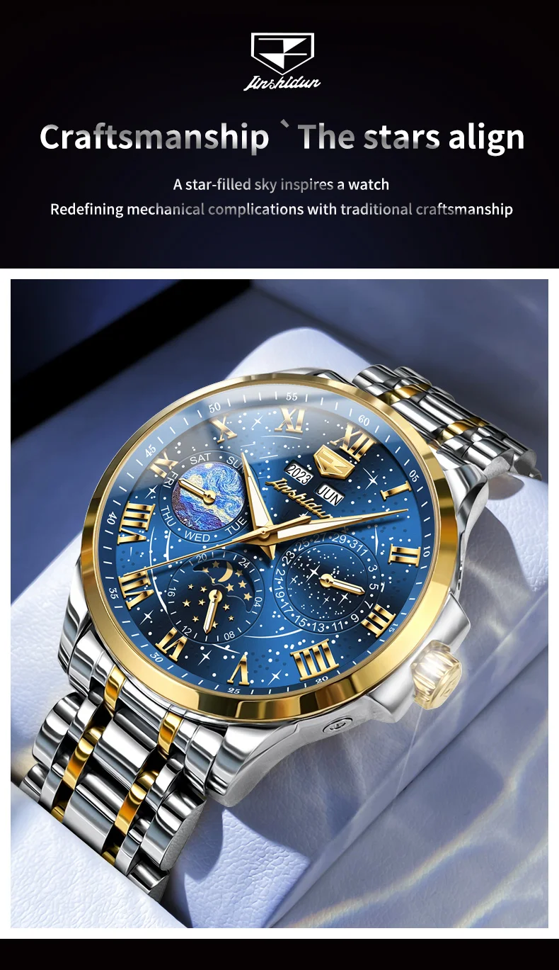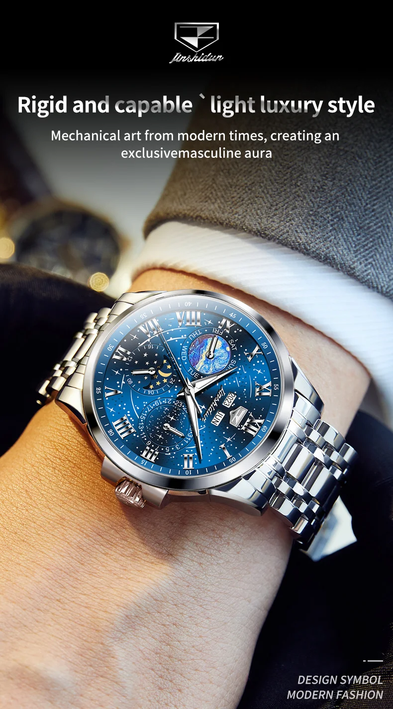 This watch is not just an accessory; it’s a companion that speaks volumes about the wearer’s taste and sophistication. Whether you’re dressing up for a special occasion or looking for a reliable timepiece for daily wear, the JADUN Original Starry Sky 24-Hour Moon Phase Luxury Men’s Watch is a choice that combines elegance, functionality, and durability in one stunning package.