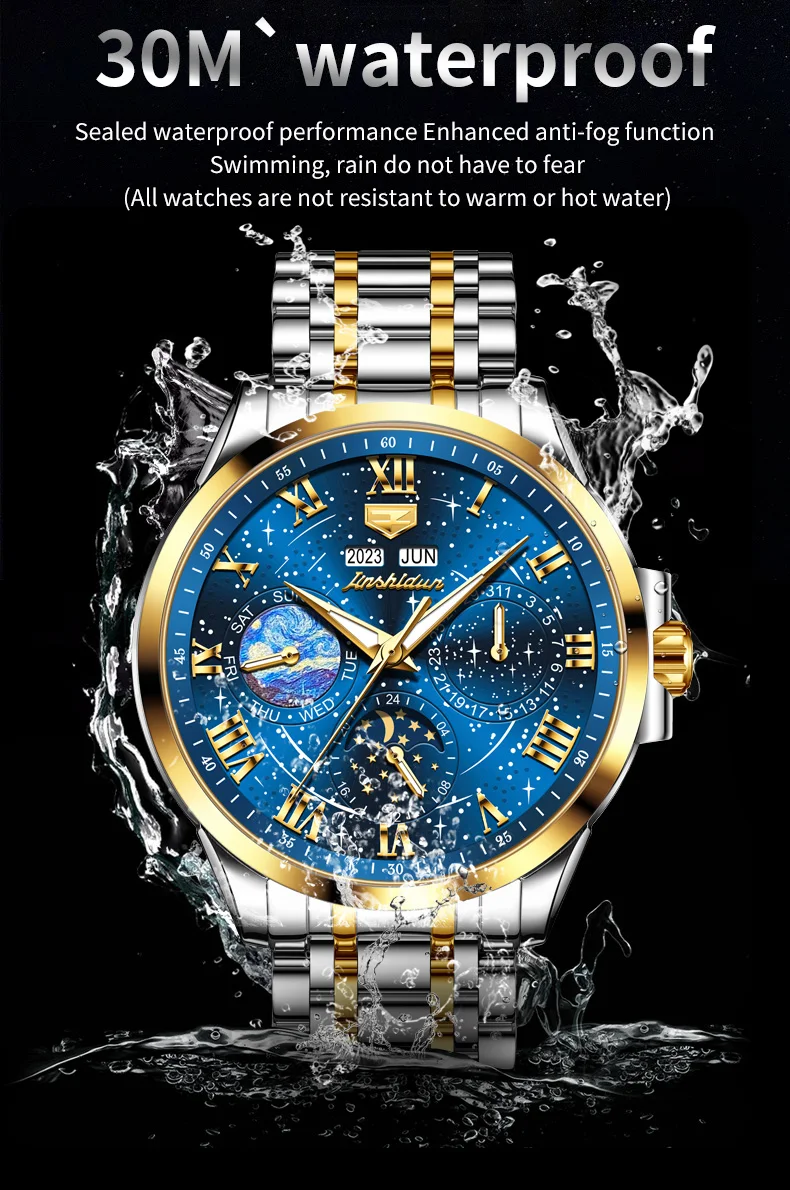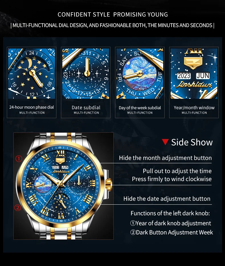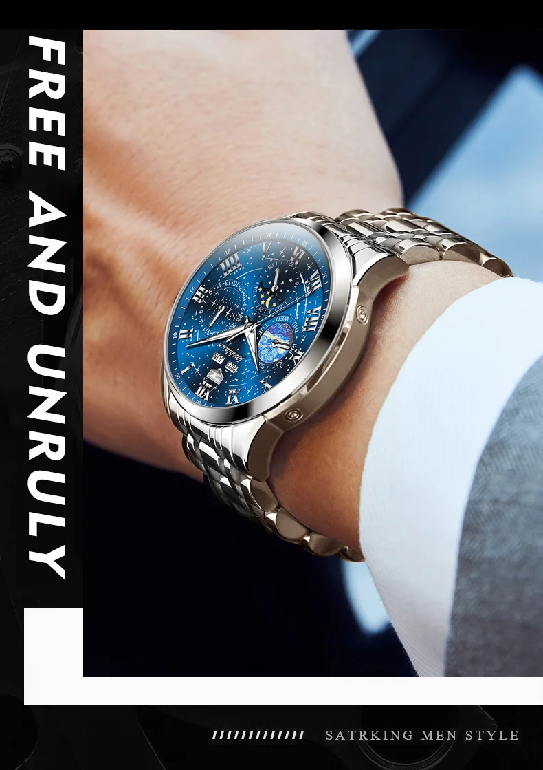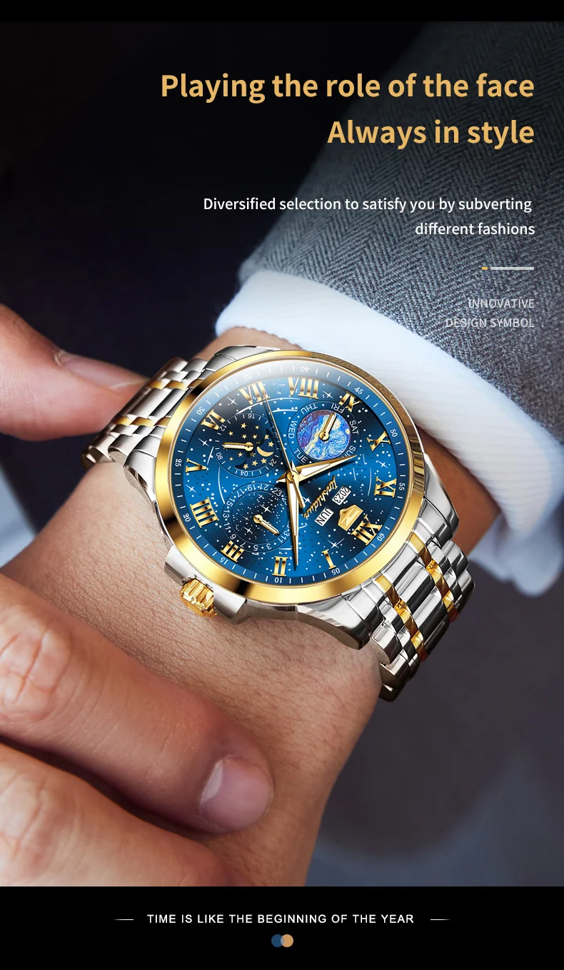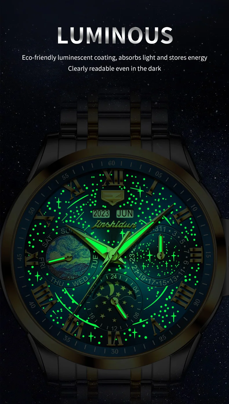 This watch is not just an accessory; it’s a companion that speaks volumes about the wearer’s taste and sophistication. Whether you’re dressing up for a special occasion or looking for a reliable timepiece for daily wear, the JADUN Original Starry Sky 24-Hour Moon Phase Luxury Men’s Watch is a choice that combines elegance, functionality, and durability in one stunning package.