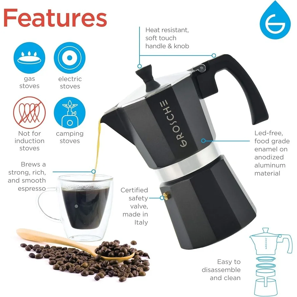 - Moka espresso coffee and latte kit: Stovetop espresso maker, moka pot, and manual coffee percolator for home use. Make café-style espresso easily, simpler than many electric machines, and enjoy rich moka coffee. The 3-cup espresso maker is made from anodized aluminum. Use the included milk frother to make lattes.