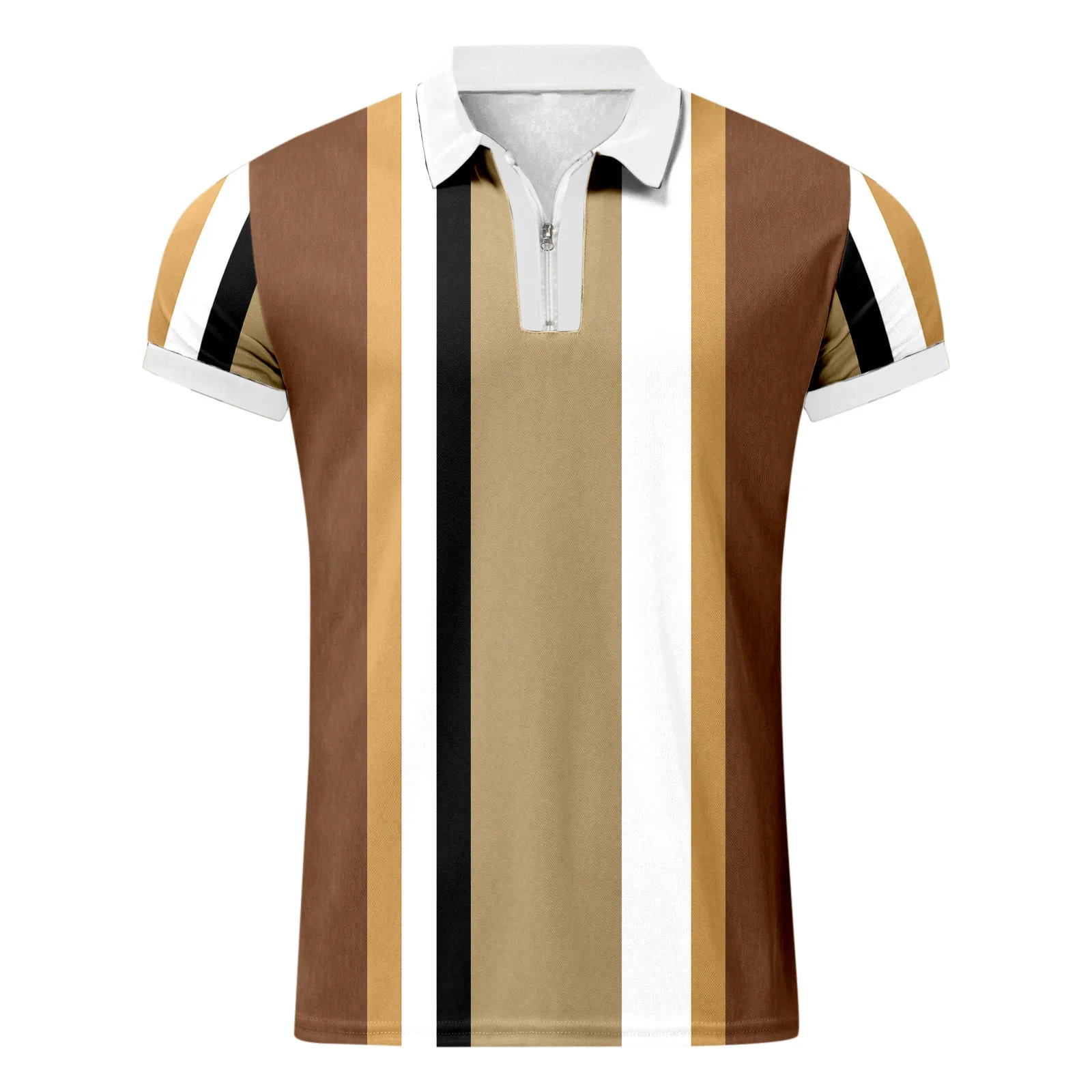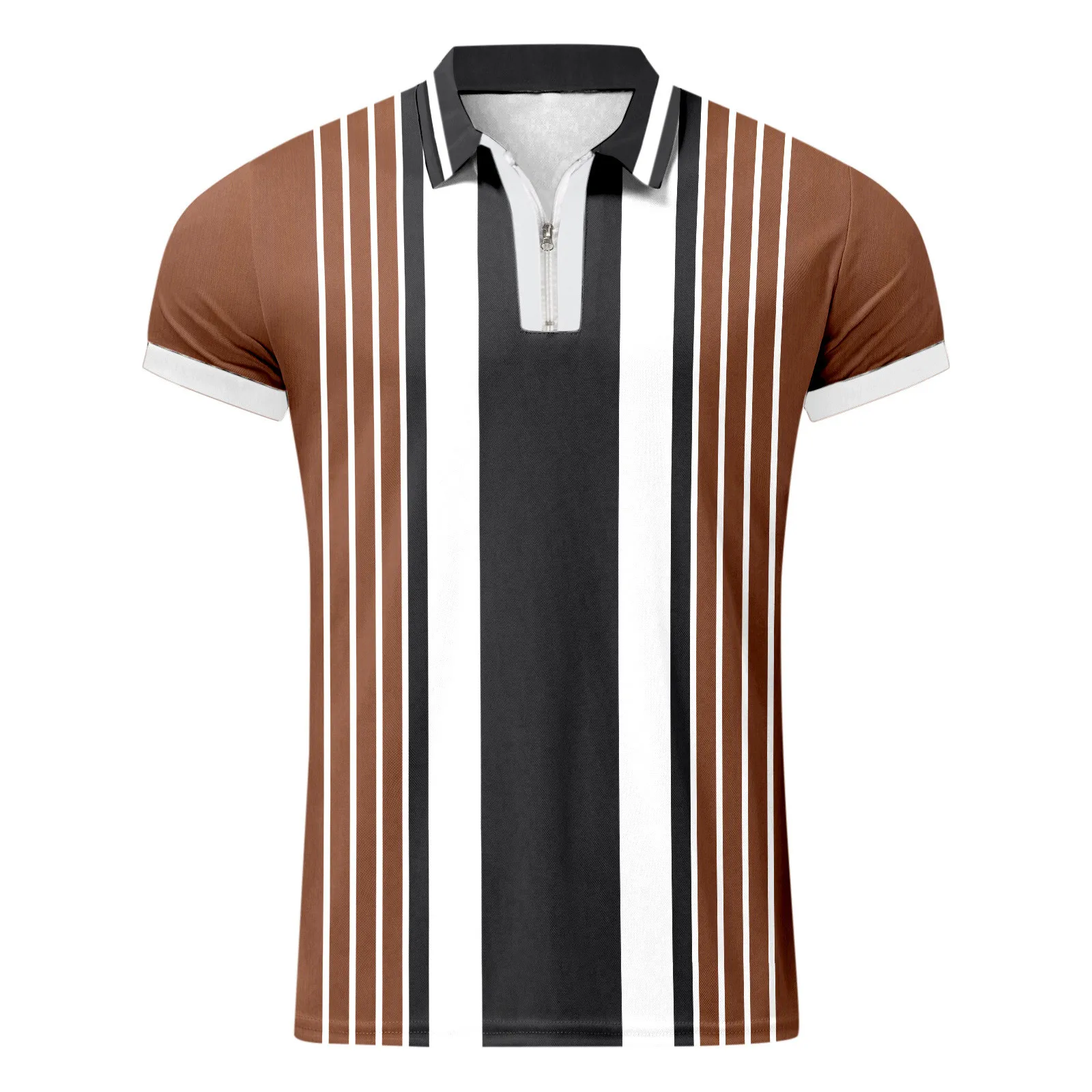 Features: Stripe Printed, Turn Down Collar, Short Sleeve, Zipper.