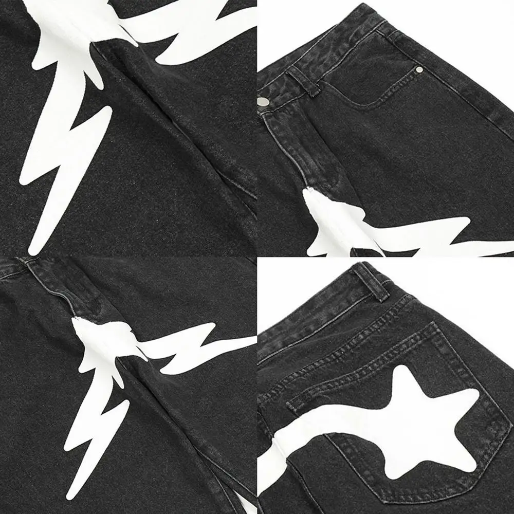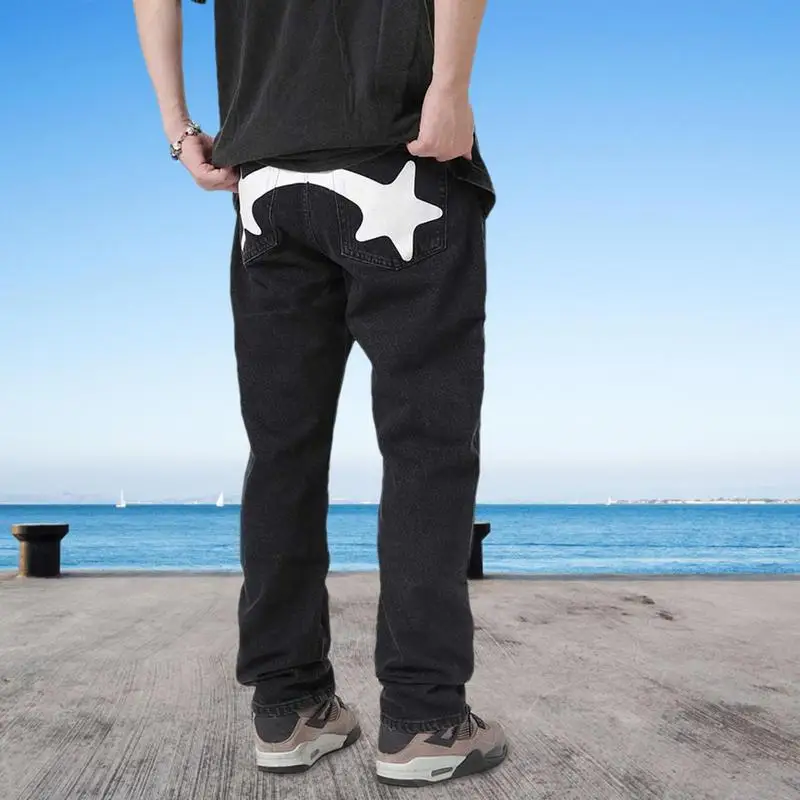 - Retro Star Pattern: With a retro star pattern on the legs, these men’s straight jeans add some original 90s flair to your look. You can rock them with any top and still look stylish and attractive. They have a loose fit and an oversized hip-hop style that provides you with comfort and flexibility.