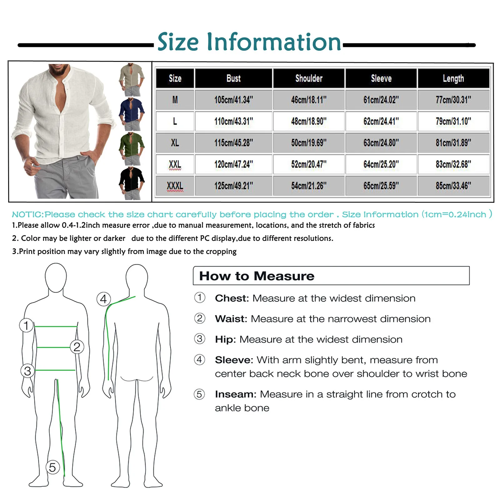 - XXXL: Bust 125cm/49.21”, Shoulder 54cm/21.26”, Sleeve 65cm/25.59”, Length 85cm/33.46”