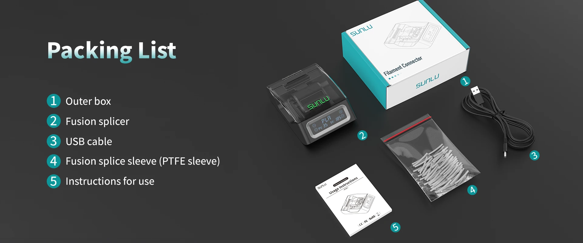 The SUNLU Filament Connector comes as a complete kit, including the fusion splicer, USB cable, fusion splice sleeves (PTFE sleeves), and clear instructions for use. Invest in smarter filament management, reduce your printing costs, and unlock new possibilities for your 3D creations with this essential tool.