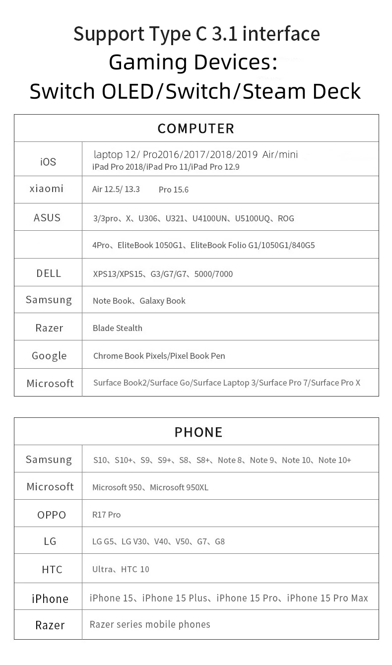 - Computers: MacBook Air/Pro (2016–2019), iPad Pro (USB-C), Dell XPS13/XPS15, ASUS ROG, Zenbook, U Series, Microsoft Surface, Samsung Galaxy Book, HP EliteBook
