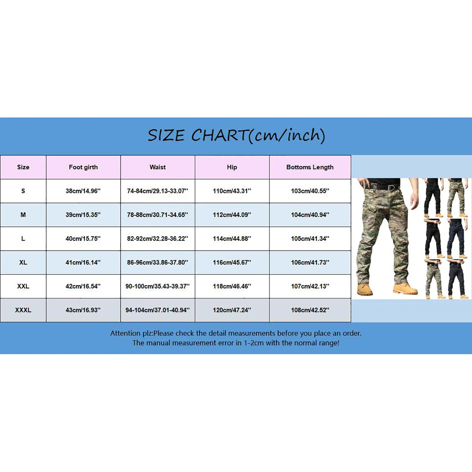 - Size XXXL: Waist: 94-104cm / 37.01-40.94″, Hip: 120cm / 47.24″, Foot girth: 43cm / 16.93″, Length: 108cm / 42.52″