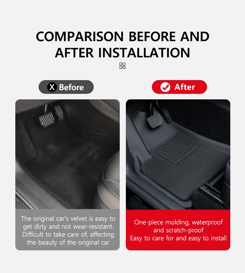 NovaAcc floor mats are specifically designed for the Tesla Model 3 Highland, ensuring a perfect fit that covers every inch of your car. These car mats provide complete coverage, protecting your car from dirt, spills, and debris.
