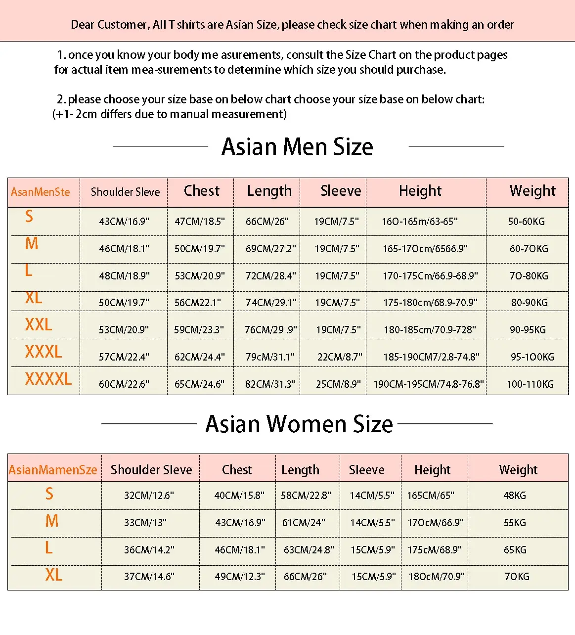 Note 1: The sizes are Asian sizes, which are a little smaller than US sizes. 1 inch = 2.54 cm, 1 cm = 0.39 inch.