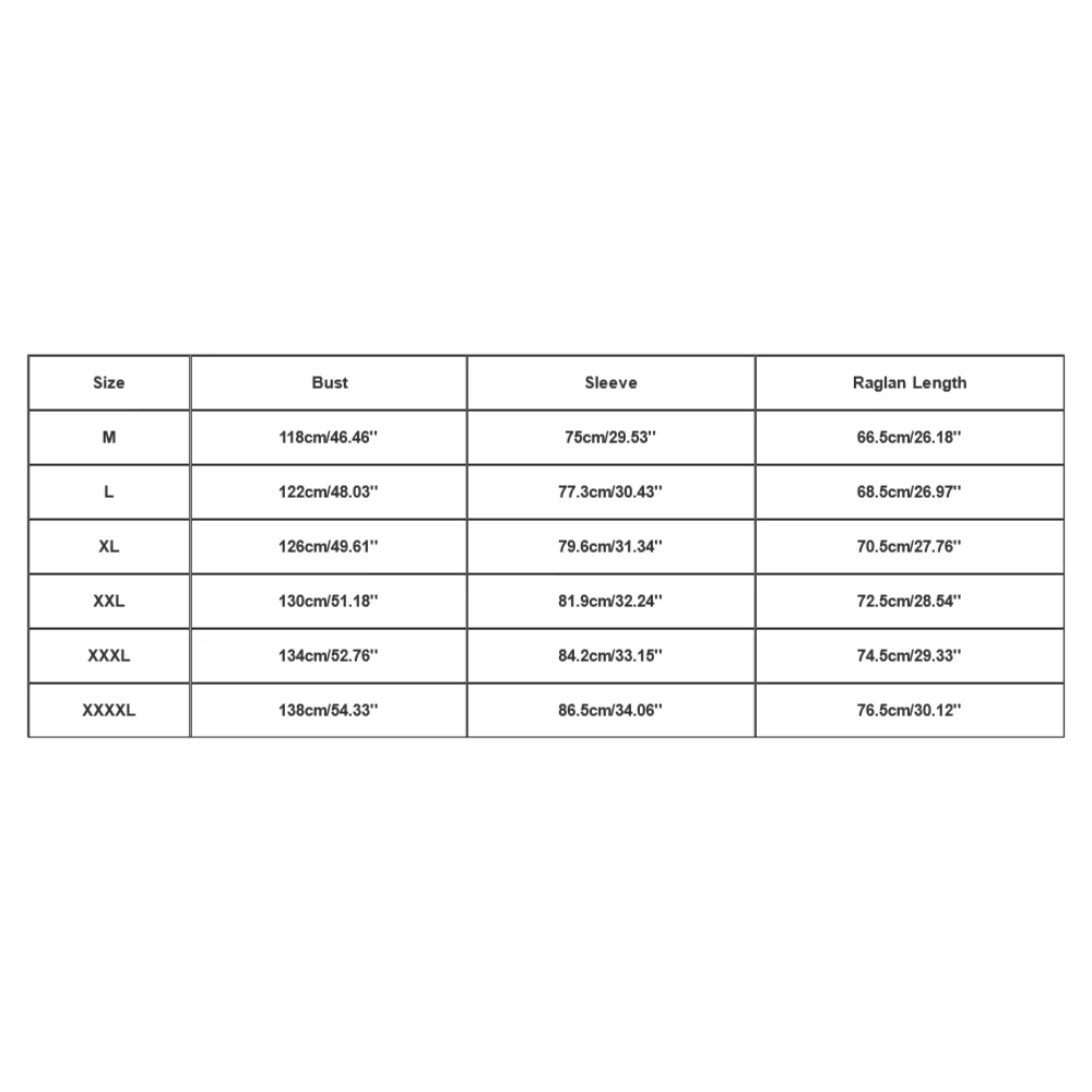- Size XXL – Bust: 130cm/51.18”, Sleeve: 81.9cm/32.24”, Raglan Length: 72.5cm/28.54”