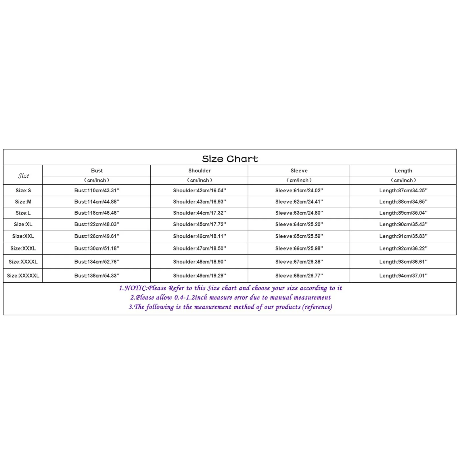 Size XXXXL: Bust: 134cm/52.76”, Shoulder: 48cm/18.90”, Sleeve: 67cm/26.38”, Length: 93cm/36.61”