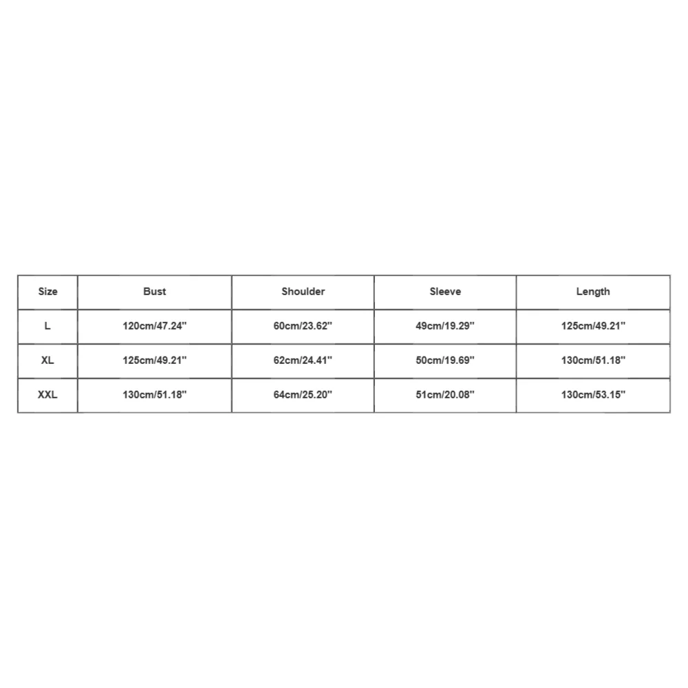 - Large (L): Bust – 120 cm/47.24”, Shoulder – 60 cm/23.62”, Sleeve – 49 cm/19.29”, Length – 125 cm/49.21”