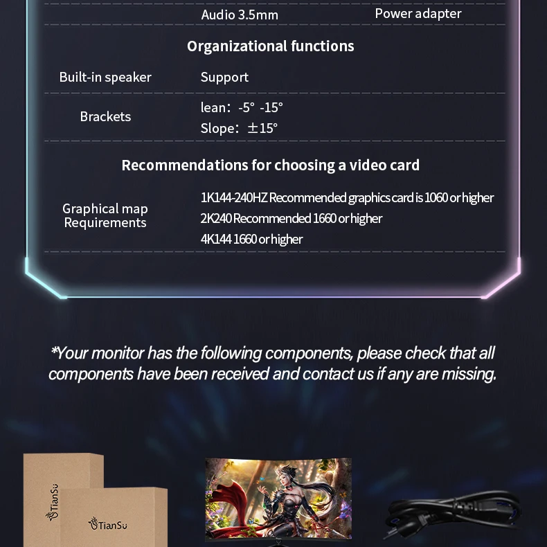 - Packing List: HDMI Cable × 1, DP Cable × 1, Power Cord × 1, Manual × 1, Double-Layer Packaging