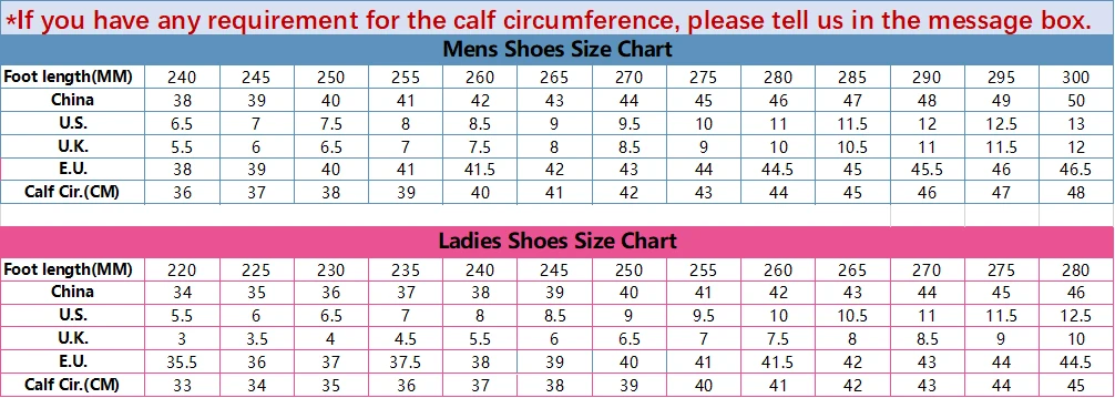 Shoe size: Female 39(245mm) – 50(300mm), please note your size if ordering
