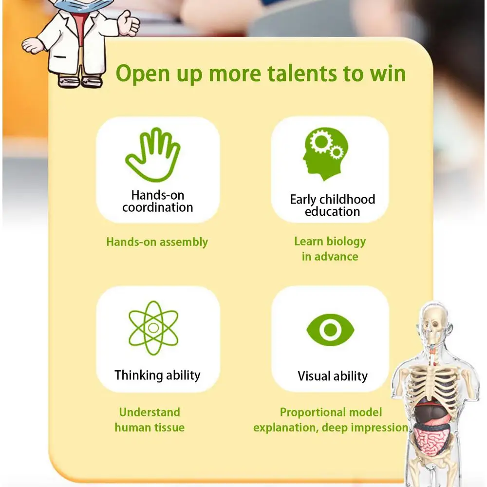 Explore the secrets of the human body with the Kids Anatomy Toys. These toys deepen your knowledge of anatomy as you assemble each part to form the complete half-body torso model. Perfect for boys and girls, these toys are designed for long-term use, making learning about human anatomy fun and interactive.