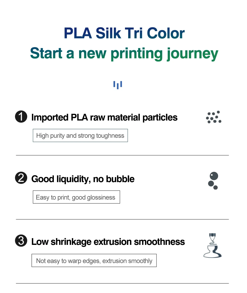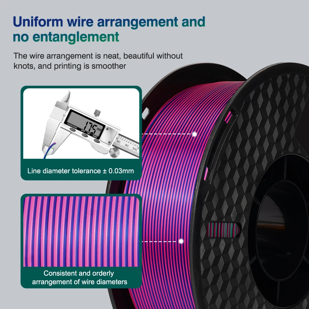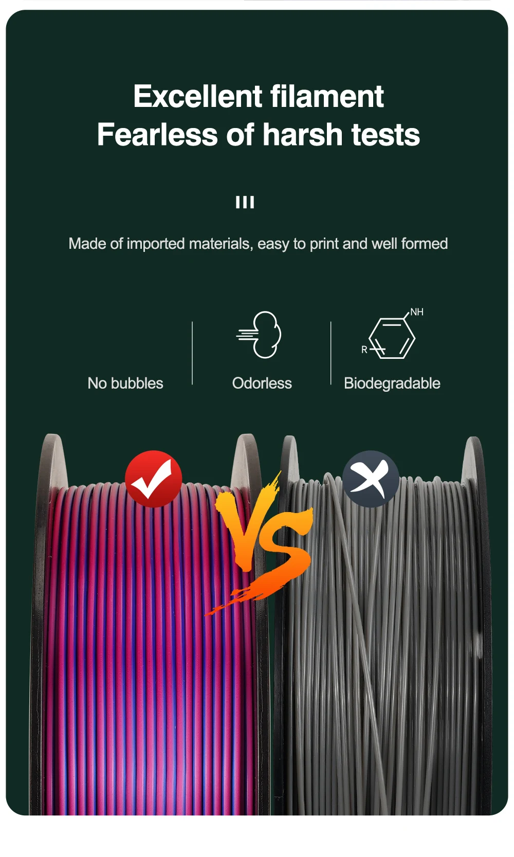 Elevate your 3D printing projects with our innovative PLA Silk dual and tri-color filament, designed to bring an extraordinary aesthetic and superior performance to your creations. Achieve breathtaking prints with a luxurious silk texture and dynamic color shifts that captivate from every angle. This isn’t just filament; it’s a new journey in vibrant, high-quality 3D printing.