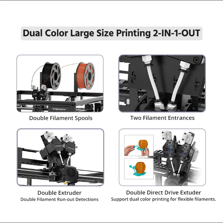 The TRONXY VEHO 600-2E is a large-scale 3D printer equipped with a dual extruder system. This advanced printer is designed to cater to the needs of professionals and hobbyists alike, offering a substantial printing volume for larger projects. Its dual extruder feature allows for the use of two different materials or colors simultaneously, greatly enhancing the versatility and complexity of the prints.