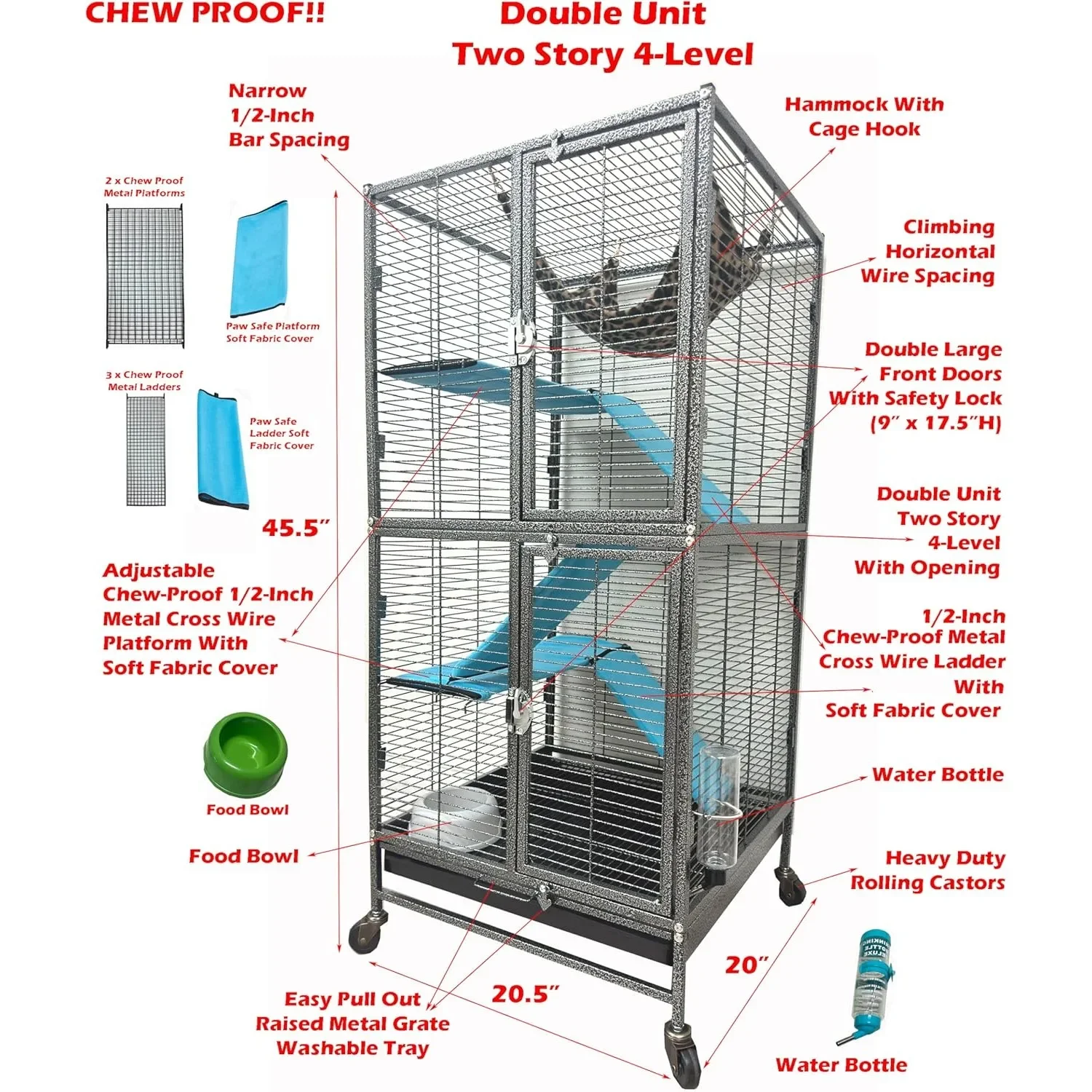 - Size: 20.5 inches long, 20 inches wide, 45.5 inches high (on rolling stand). Chew-Proof: All metal.