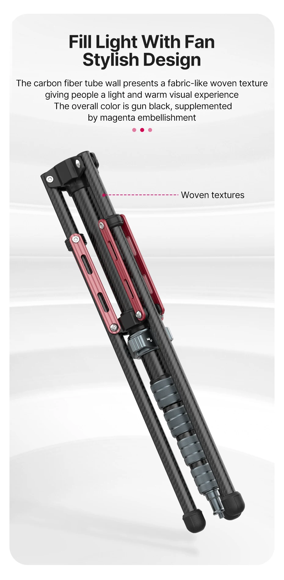 The carbon fiber tube features a woven texture for a refined look. The overall finish is gunmetal black with subtle magenta accents.