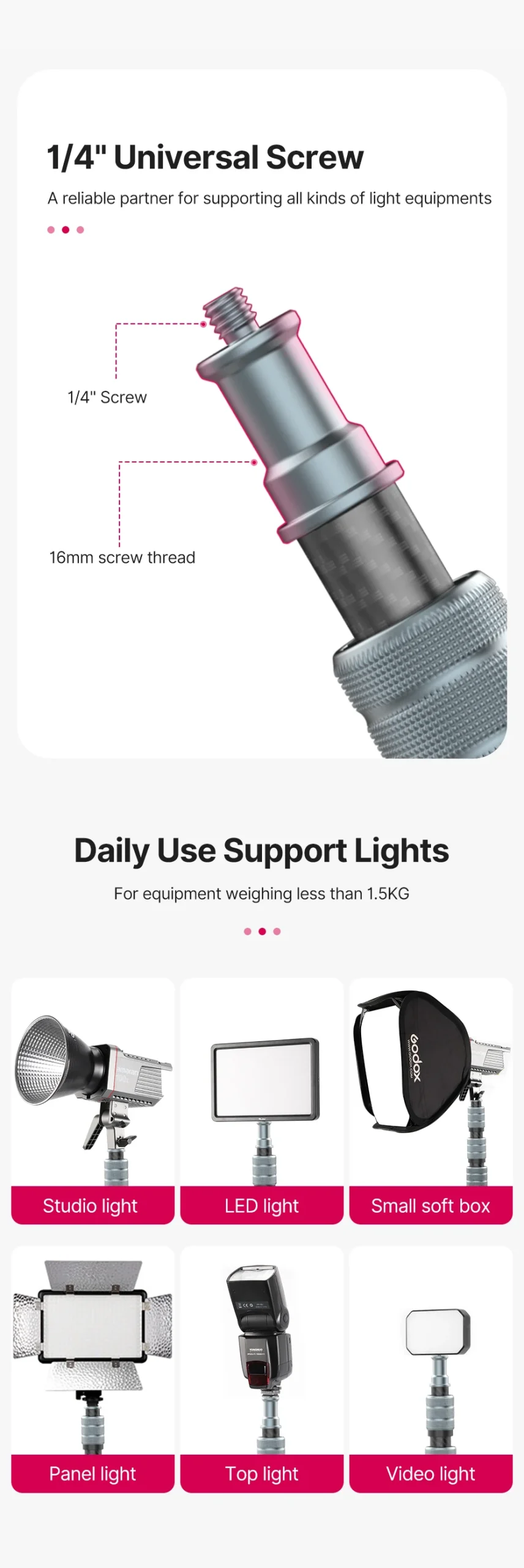 - Compatible items: studio lights, LED lights, small softboxes, panel lights, top lights, video lights
