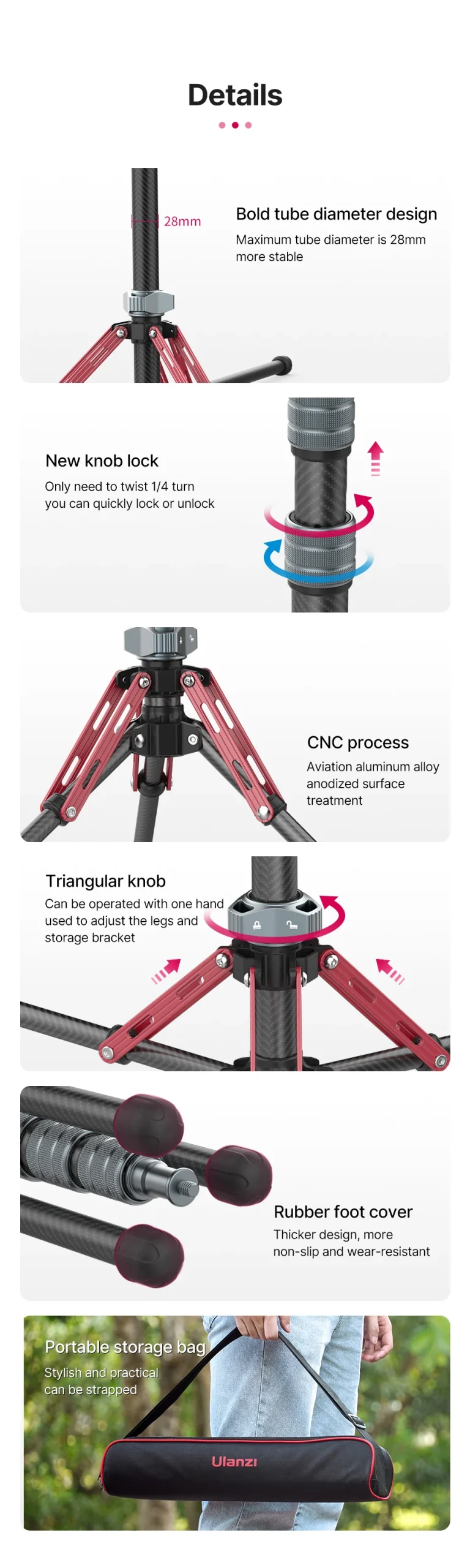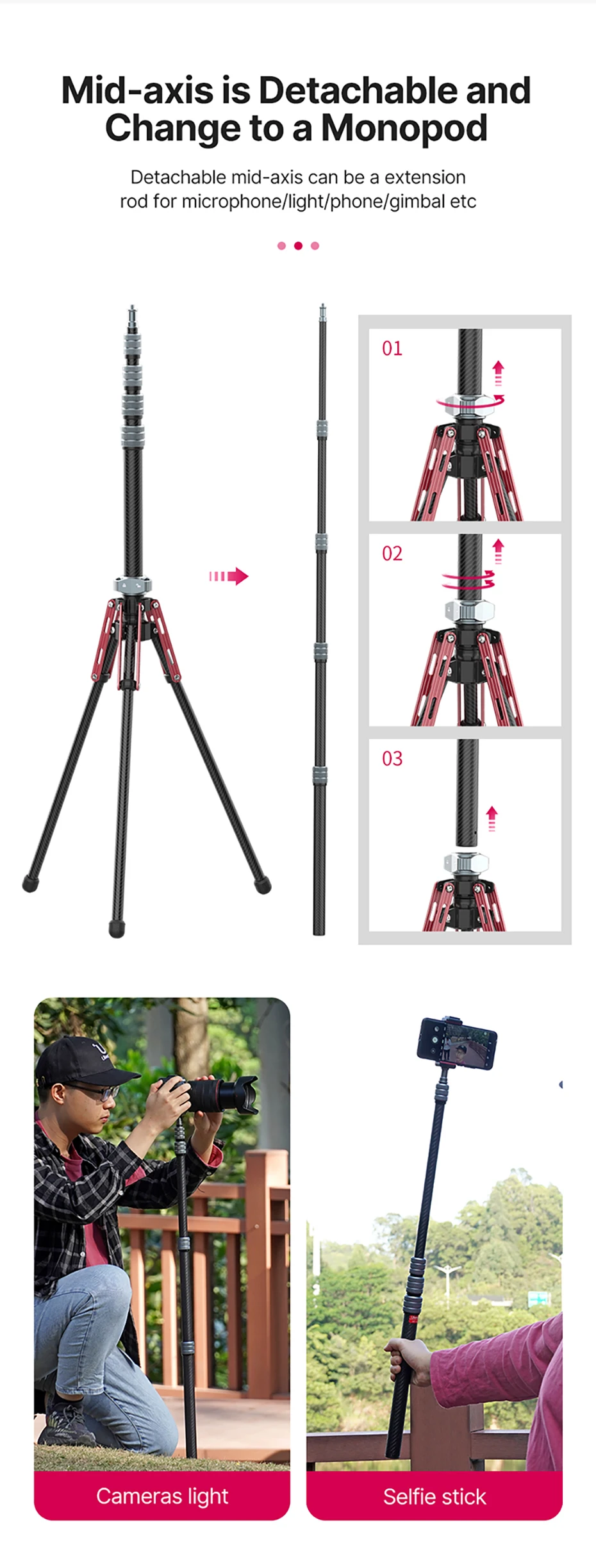 The removable center column functions as an extension rod for microphones, lights, phones, and gimbals. It can also be used as a selfie stick with a compact camera or light.