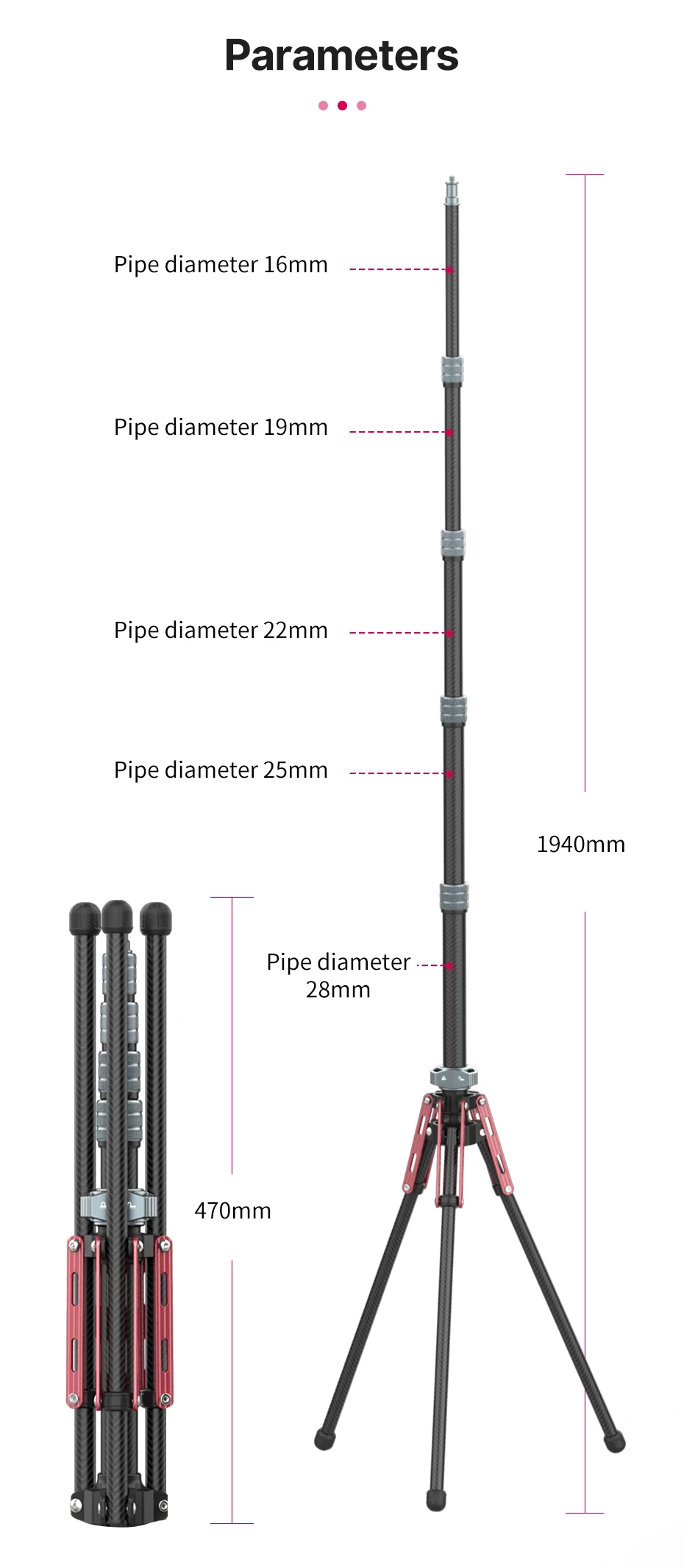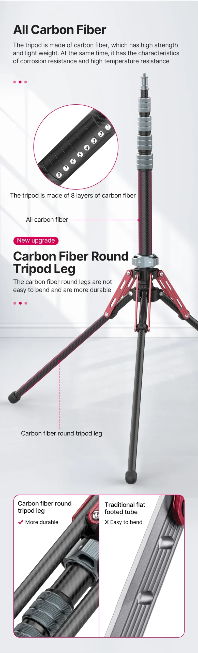 Compared to flat aluminum arms on typical tripods, round carbon fiber tubing offers stronger compression resistance and is less prone to bending.