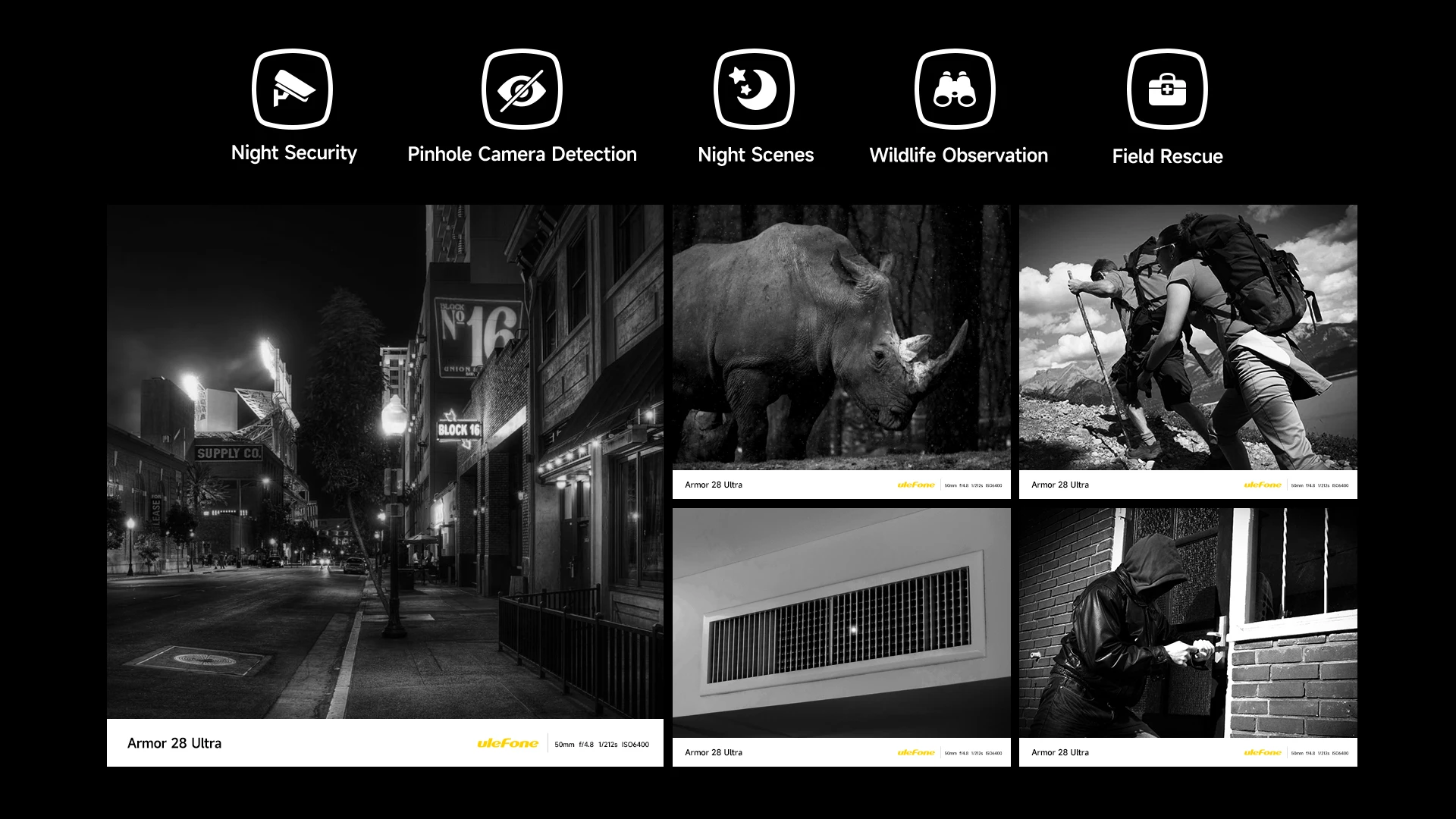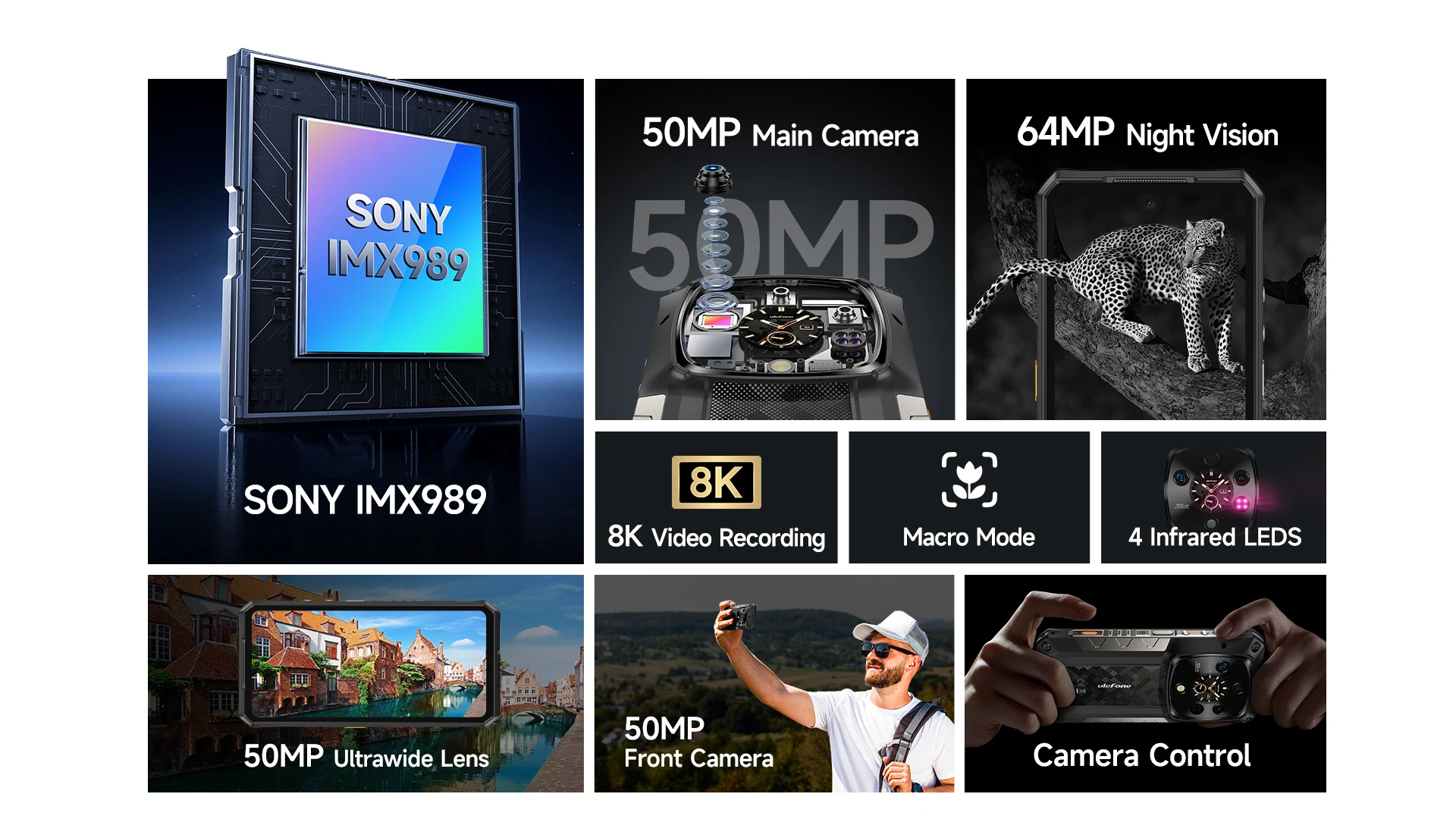 The Ulefone Armor 28 Ultra is equipped with a versatile multi-camera system designed for detailed photography in a wide range of environments. The main camera uses a 50MP Sony IMX989 1-inch sensor for improved light capture and sharp image quality. It also includes a 50MP ultra-wide macro camera, a 64MP night vision camera with infrared support, and a 50MP front camera for selfies, video calls, and content creation.