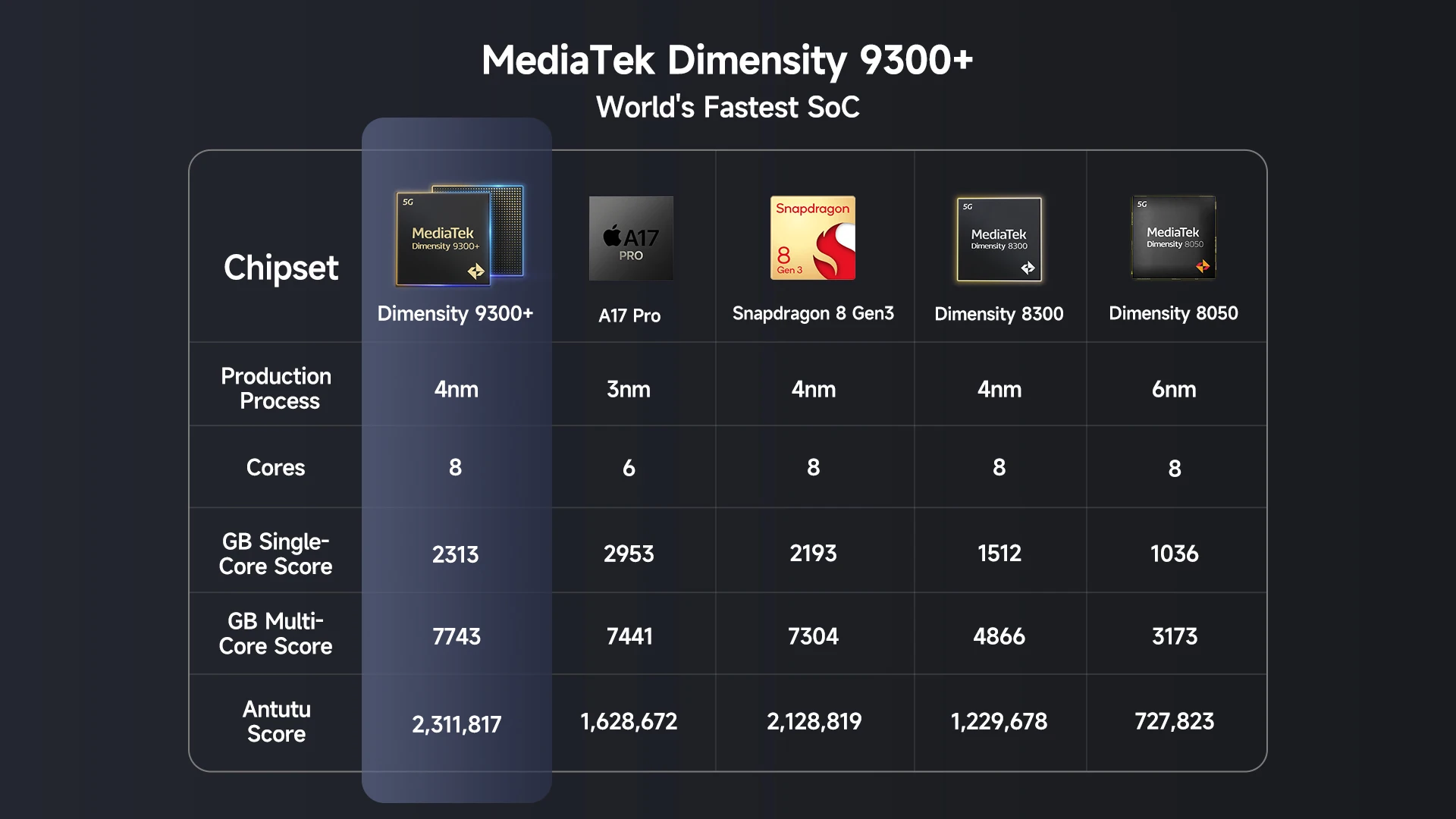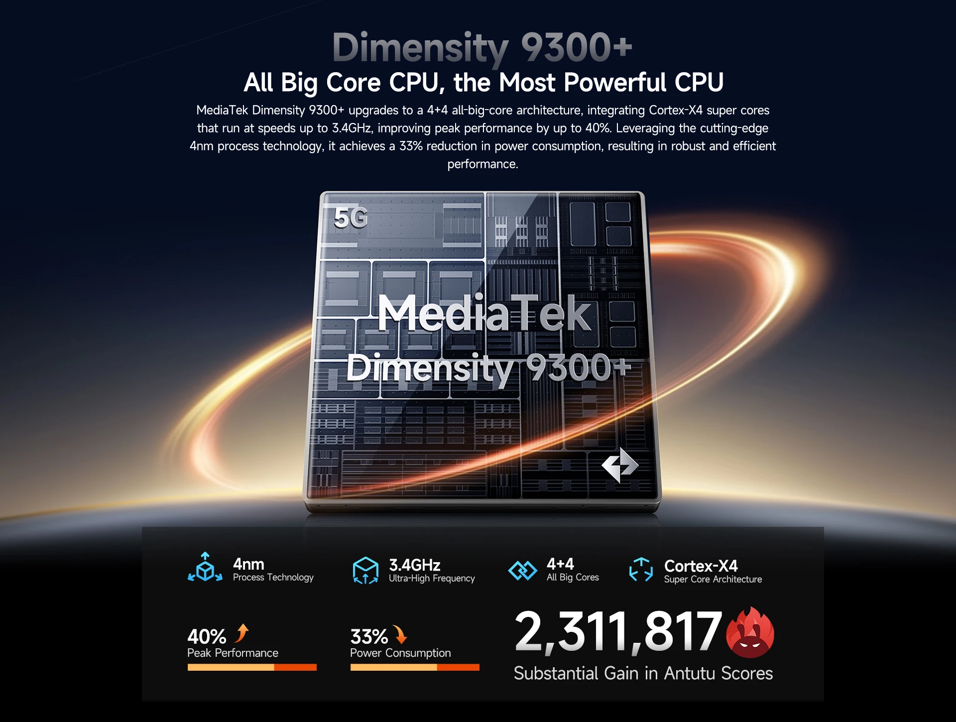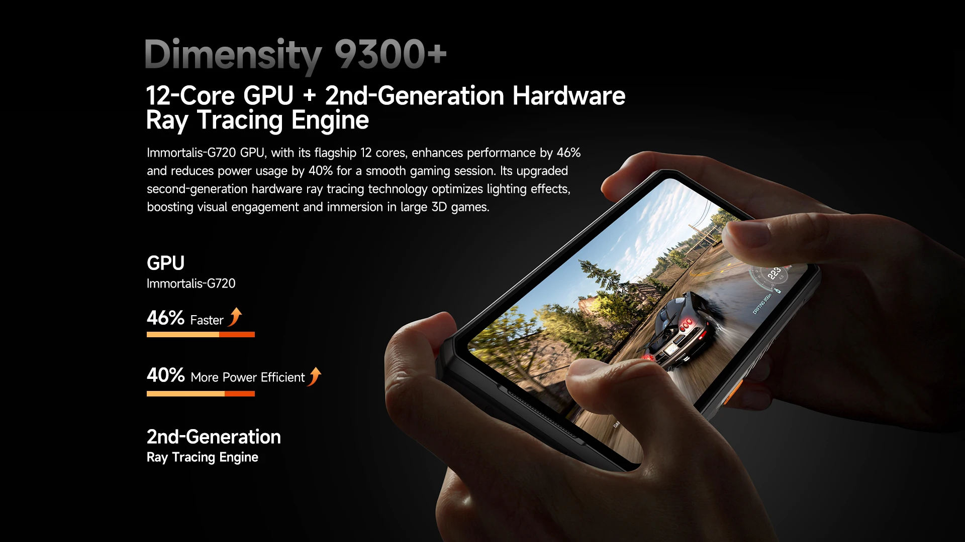 This model is powered by the MediaTek Dimensity 9300+ processor with an all-big-core architecture built for fast app response, efficient multitasking, and strong gaming performance. It also features a 12-core Immortalis-G720 GPU with hardware ray tracing support, making it a strong option for users who want smoother graphics and better visual performance in supported games and applications.