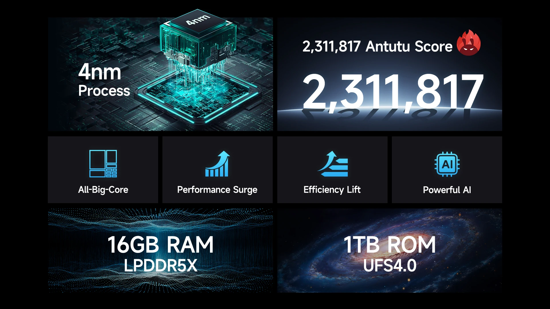 The phone includes 16GB LPDDR5X RAM with up to 16GB dynamic memory expansion for a total of up to 32GB RAM, along with 1TB of UFS 4.0 storage. This combination provides fast read and write speeds, more room for apps, media, and files, and a smoother experience when switching between tasks.