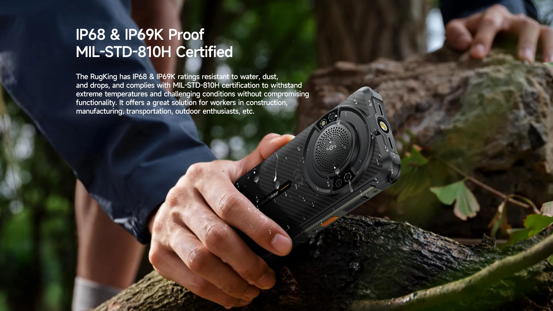 RugKing is splash, water, and dust resistant and tested under controlled laboratory conditions with an IP68 rating under IEC standard 60529 for a maximum depth of 1.8 meters for up to 30 minutes. Charger and accessories are not water-resistant. Resistance may decrease over time with normal wear. Do not charge the phone while wet. Liquid damage is not covered under warranty.