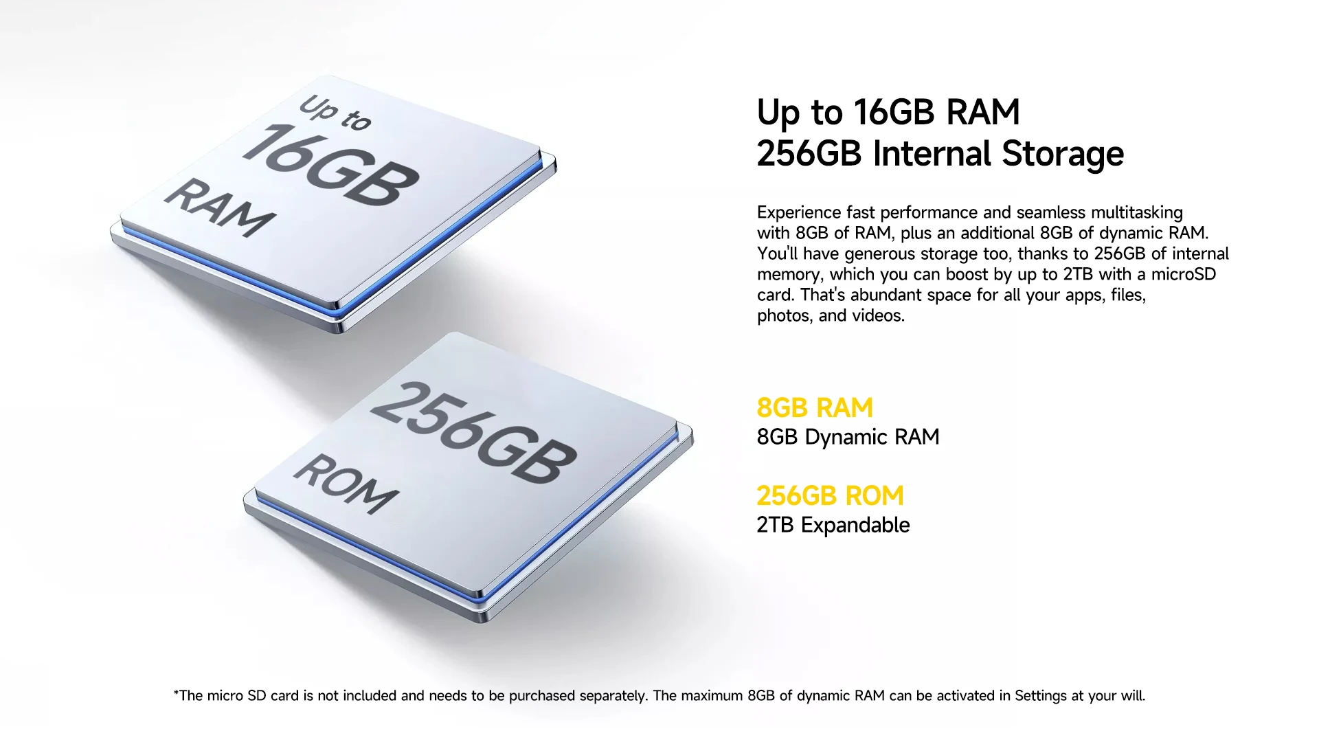 Up to 16GB RAM includes 8GB physical RAM plus up to 8GB dynamic RAM expansion.