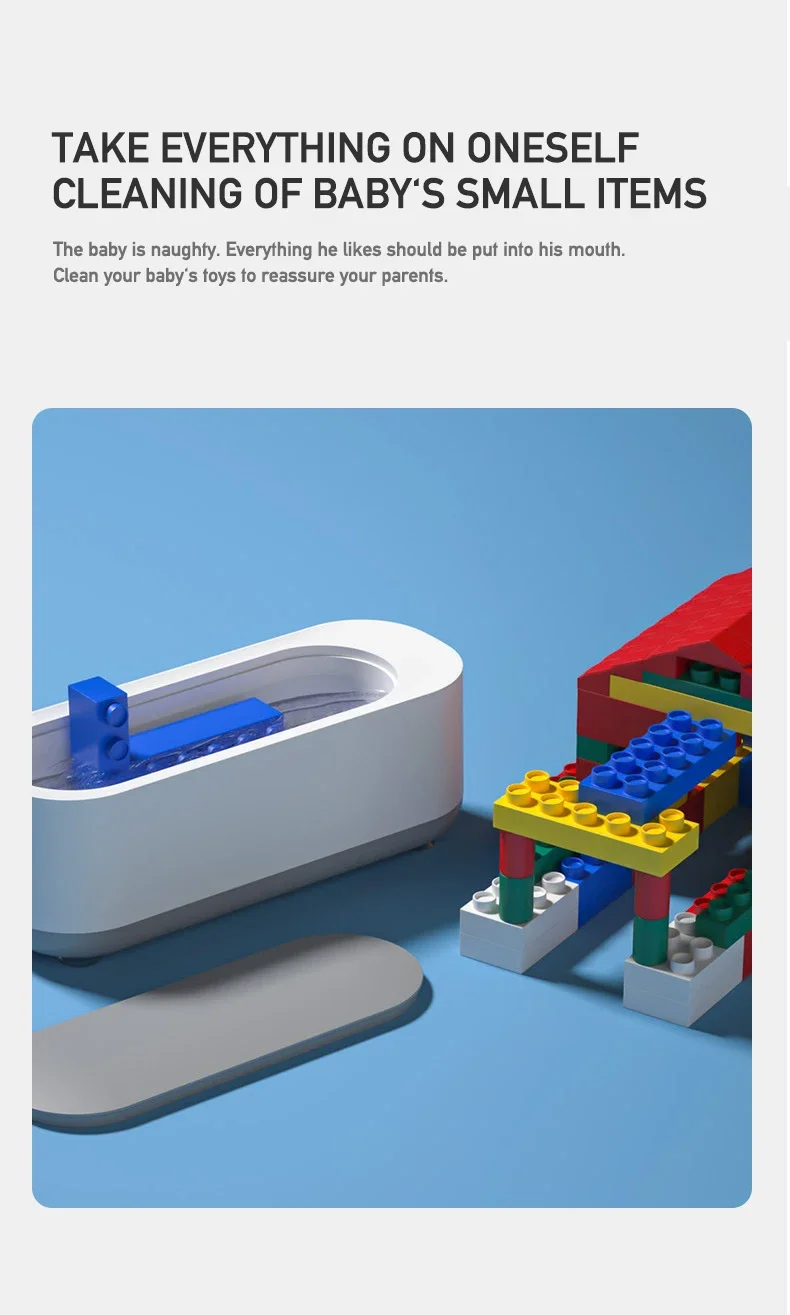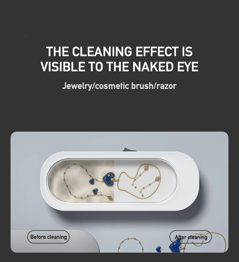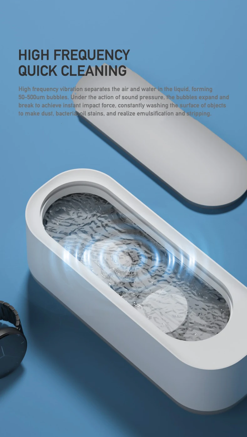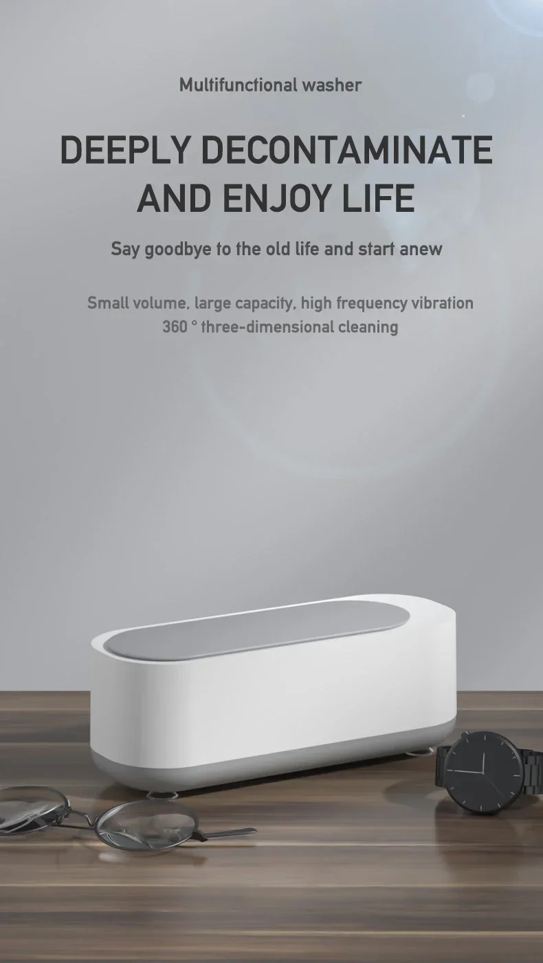 Compact ultrasonic cleaner for deep cleaning glasses, jewelry, accessories, small tools, and more.