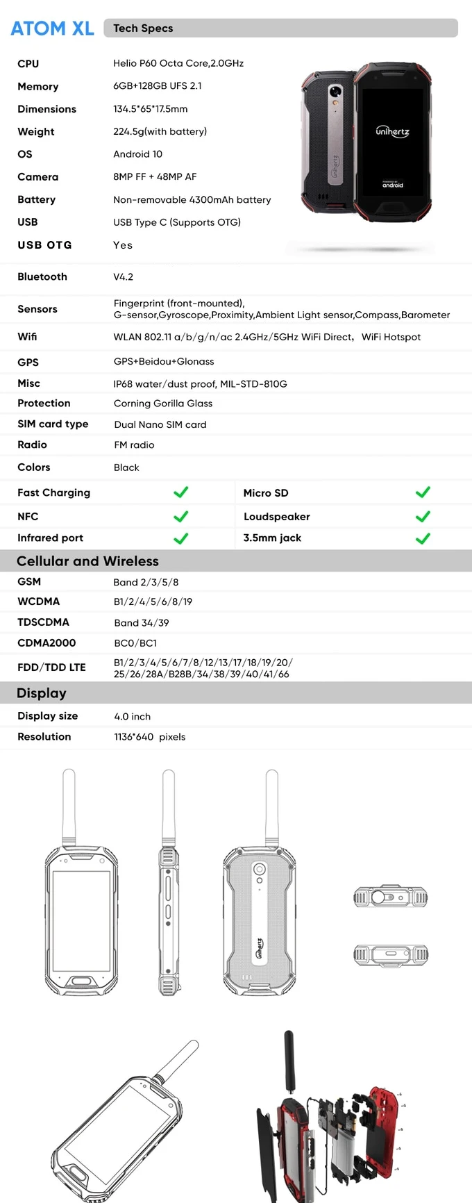 Atom XL also delivers practical smartphone performance with a Helio P60 octa-core processor, Android 11, 6GB RAM, and 128GB UFS 2.1 storage. It supports dual Nano SIM cards, expandable storage with MicroSD, NFC, Bluetooth 4.2, Wi-Fi 2.4GHz and 5GHz, USB Type-C, USB OTG, FM radio, fingerprint unlock, facial recognition, infrared, and a programmable key. For navigation and outdoor use, it supports GPS, GLONASS, and BeiDou positioning systems for more reliable location tracking.