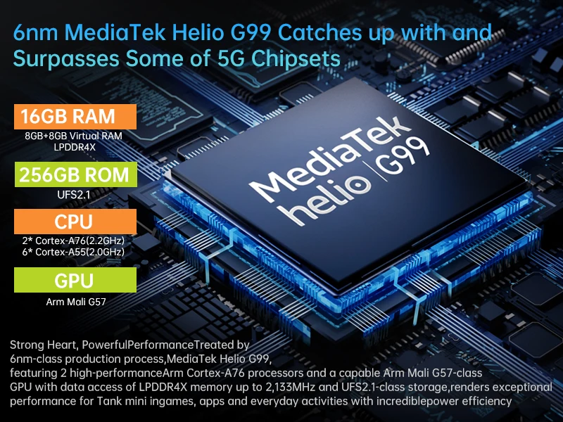 This smartphone is shown with Android 13 and a 4.3-inch display featuring 540 x 1200 resolution, 306 PPI, and 500 nits of brightness for clear viewing in daily use. Performance details shown include a 6nm MediaTek Helio G99 processor, 256GB ROM, and 8GB RAM plus 8GB expansion for up to 16GB RAM. A 5800mAh battery adds dependable power for work, travel, and extended use throughout the day.