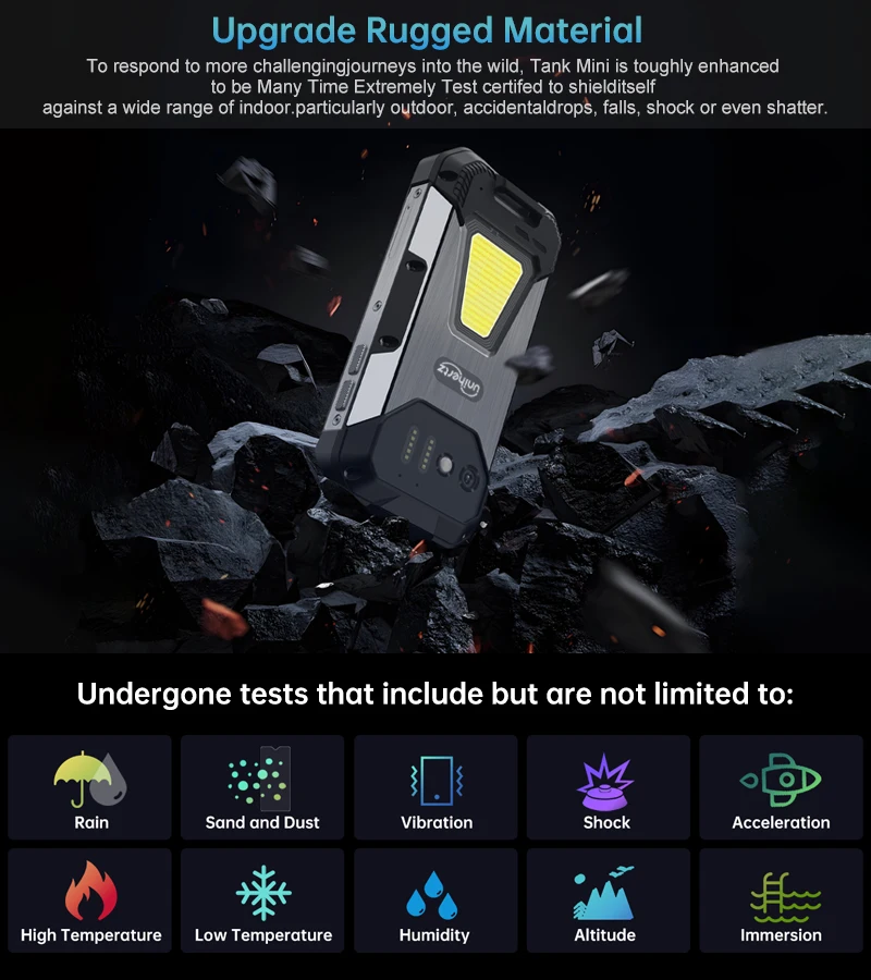 Built for demanding conditions, the product images show testing for rain, sand and dust, vibration, shock, acceleration, high temperature, low temperature, humidity, altitude, and immersion. With its compact, rugged body, strong battery, high-resolution cameras, bright flashlight, and outdoor-focused utility tools, the Unihertz Tank Mini 1 is a practical choice for hiking, job sites, travel, and active everyday use.