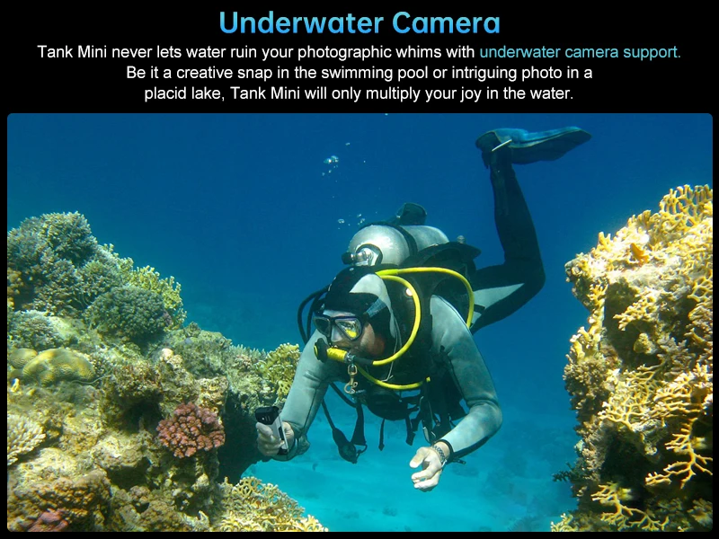 The Unihertz Tank Mini 1 also stands out for its camera and utility features. The product information shows a 100MP rear camera, a 32MP front camera, and an 800-lumen super bright flashlight for night use, emergencies, and outdoor environments. It is also presented with IP68 waterproof protection, underwater camera support, and multiple navigation systems, including GPS, Glonass, Beidou, and Galileo. The included toolkit-style functions shown in the product images include a compass, noise test, torch, camping light, leveling tools, magnifier, alarm bell, pedometer, underwater camera, protractor, elevation barometer, and yardstick.