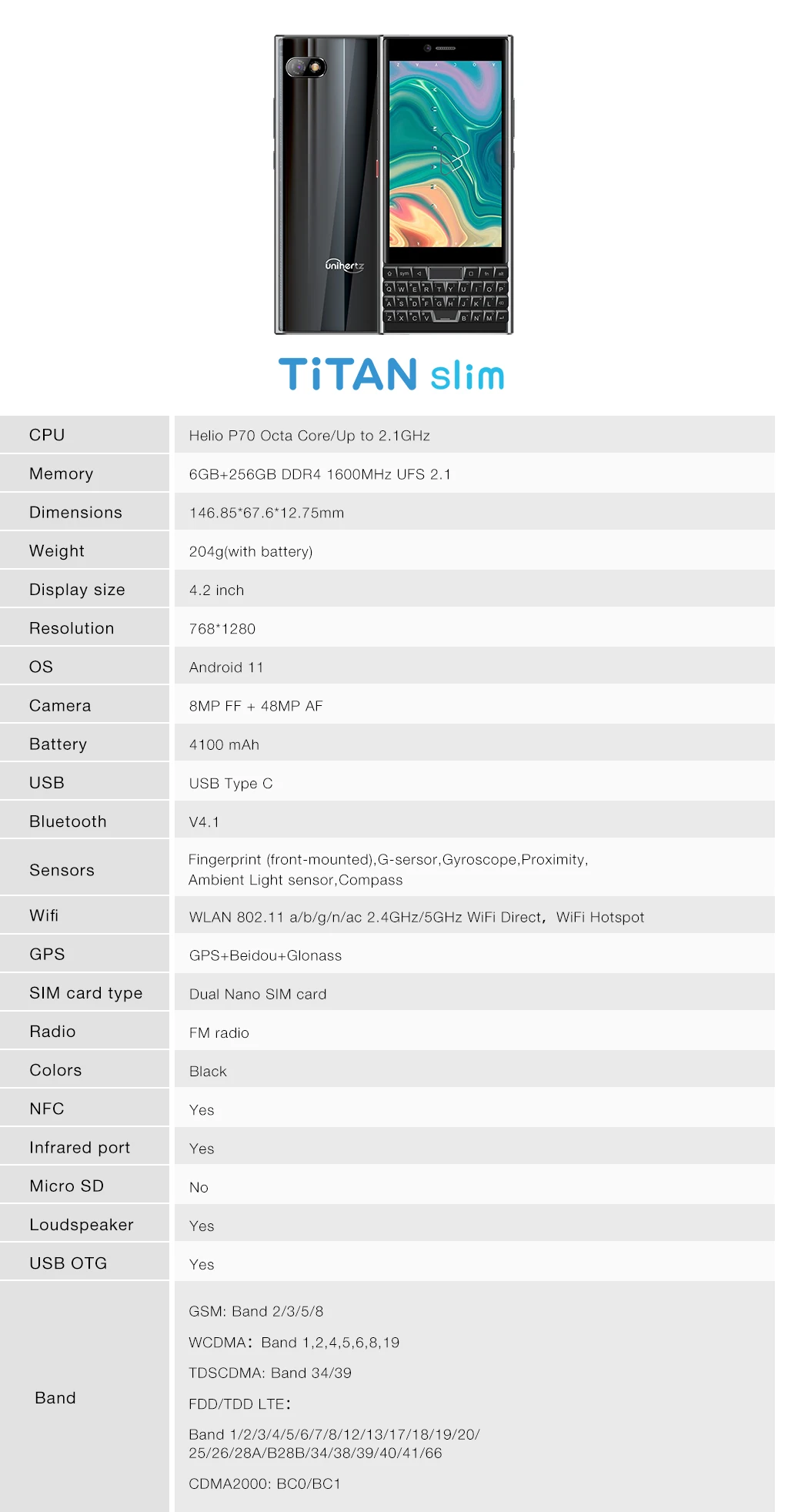 This smartphone features a full QWERTY keyboard designed for smooth and accurate typing across multiple languages, including support for international input. The keyboard also includes shortcut key functionality for faster access to apps and actions, along with a capacitive swipe feature that lets you scroll through the interface with ease. This combination makes the Titan Slim ideal for messaging, emails, productivity, and users who prefer physical keys over a touchscreen typing experience.