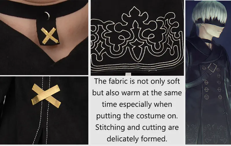 - The 9S cosplay jacket features a Peter Pan collar, hidden buttons, and an embroidered design at the bottom.