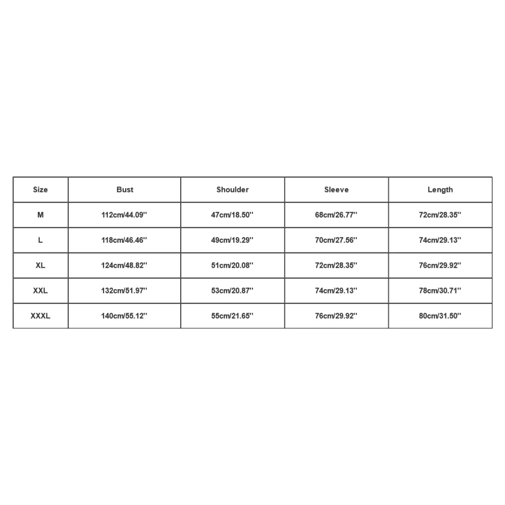 - XXXL: Bust: 140cm/55.12”, Shoulder: 55cm/21.65”, Sleeve: 76cm/29.92”, Length: 80cm/31.50”