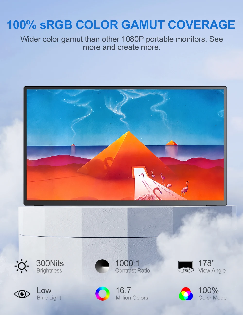 A 1080P display with 100% sRGB and 16.7 million colors provides vibrant visuals, bringing colors to life.