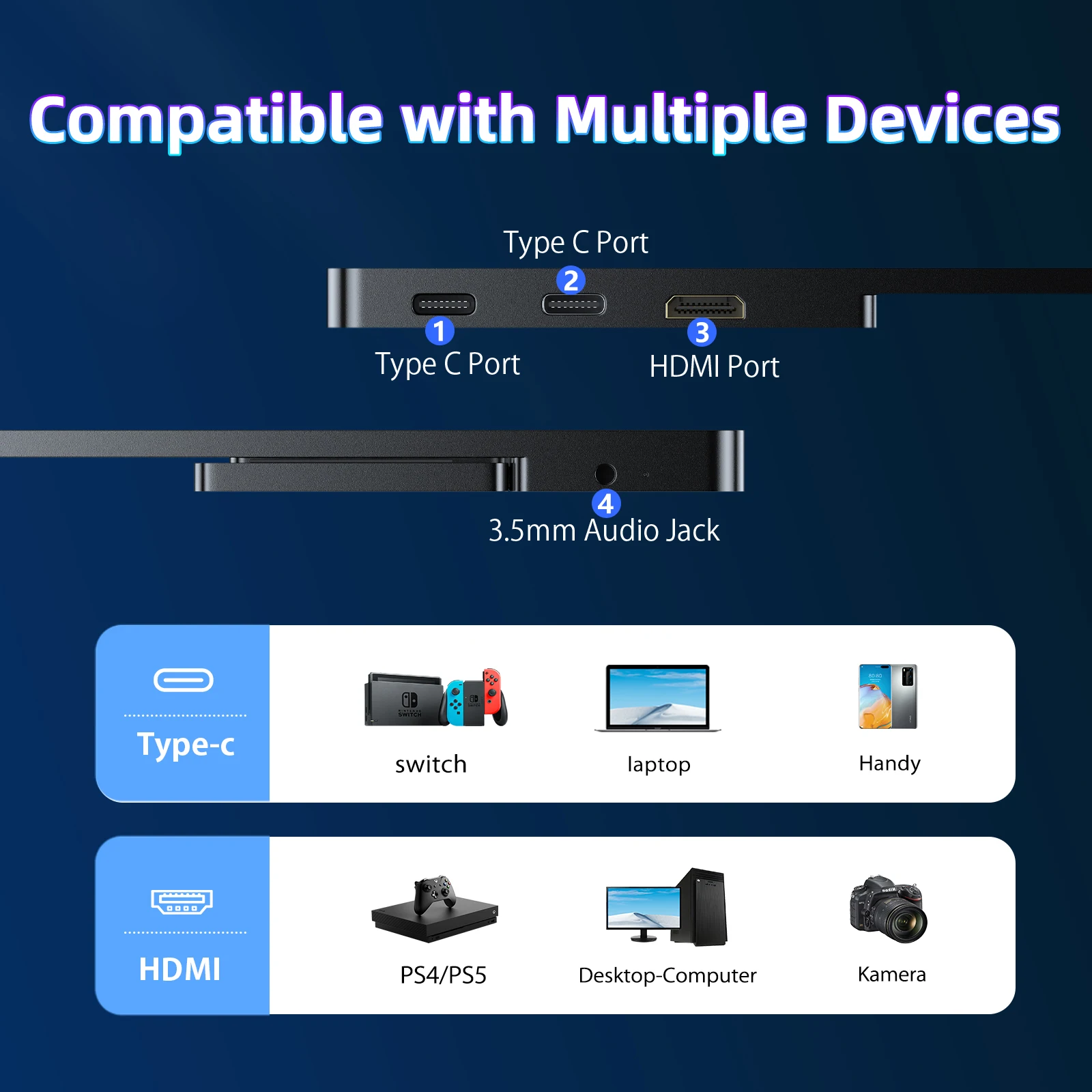- Wide Range of Connections, Excellent for Gaming: Features two Type-C ports for versatile connectivity. Compatible with devices like MacBook, Surface, the latest iPad Pro, and Android smartphones. One Type-C port can also charge the monitor. Comes standard with the necessary cables for easy setup. Ideal for gaming, with no delay and 60Hz response rate, perfect for fast-paced games and action movies.